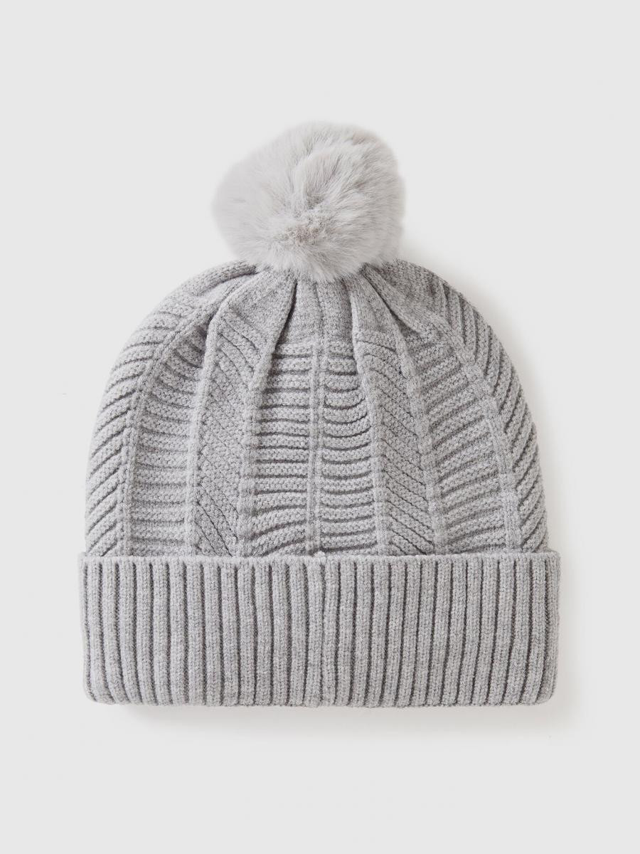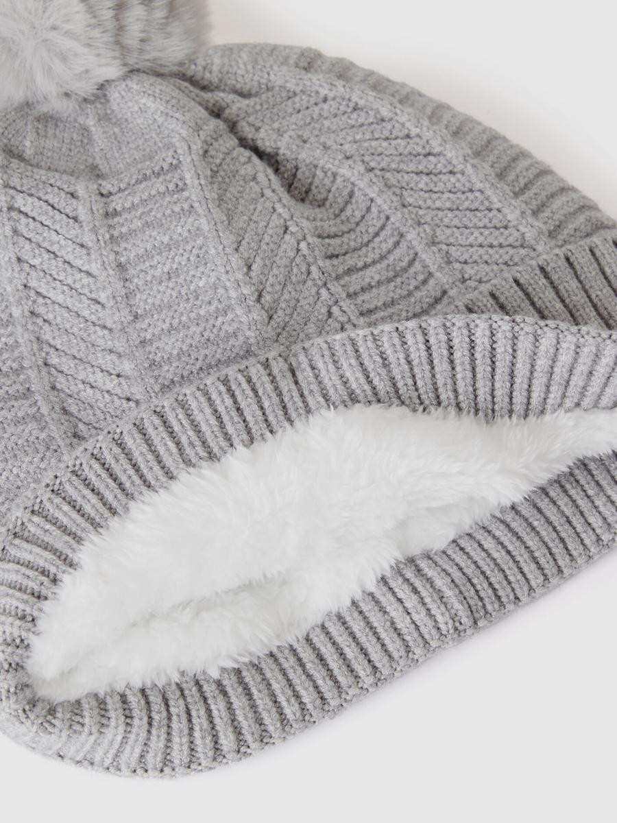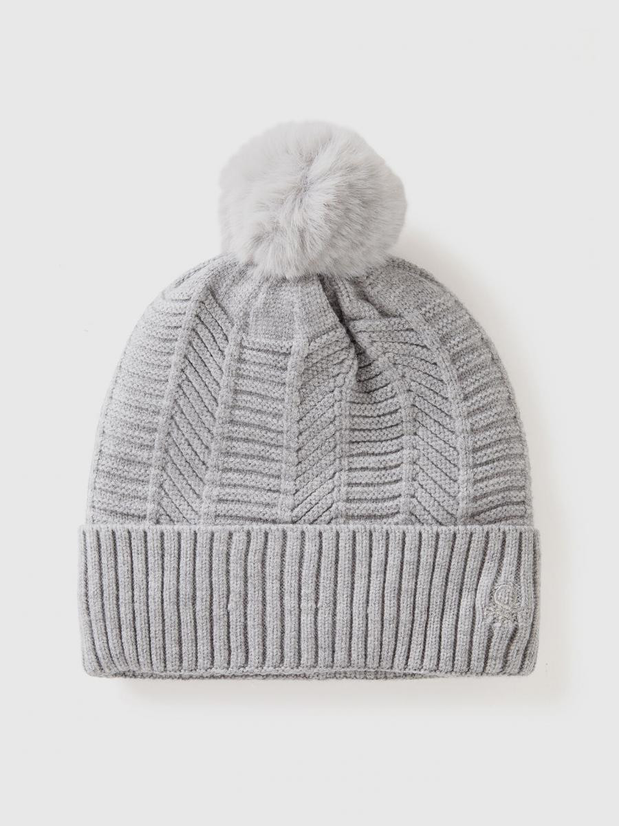 Benetton ženska pletena kapa od mešavine viskoze, podstavljena toplim veštačkim krznom. Rad riblje kosti, pom pom na vrhu i rebrasti rub.