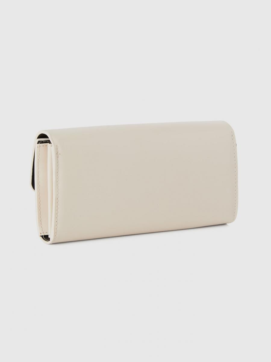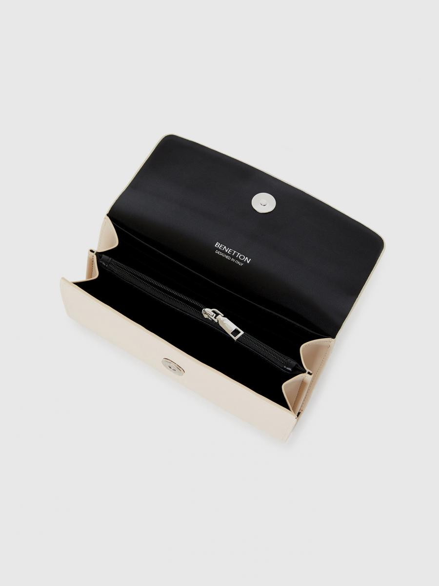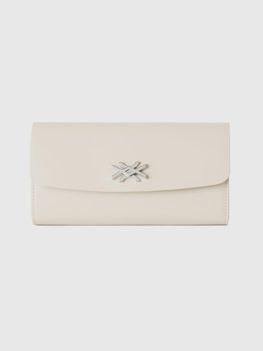 Benetton ženski pravougaoni novčanik od glatke imitacije kože. Prednji preklop i skriveni otvor sa dugmetom. Metalni logo na prednjoj strani. Dva unutrašnja odeljka za novčanice, džep za novčiće i utore za kreditne kartice. Dimenzije: 19*10*3 cm.