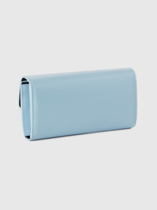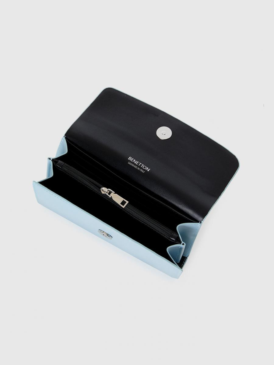 Benetton ženski pravougaoni novčanik od glatke imitacije kože. Prednji preklop i skriveni otvor sa dugmetom. Metalni logo na prednjoj strani. Dva unutrašnja odeljka za novčanice, džep za novčiće i utore za kreditne kartice. Dimenzije: 19*10*3 cm.