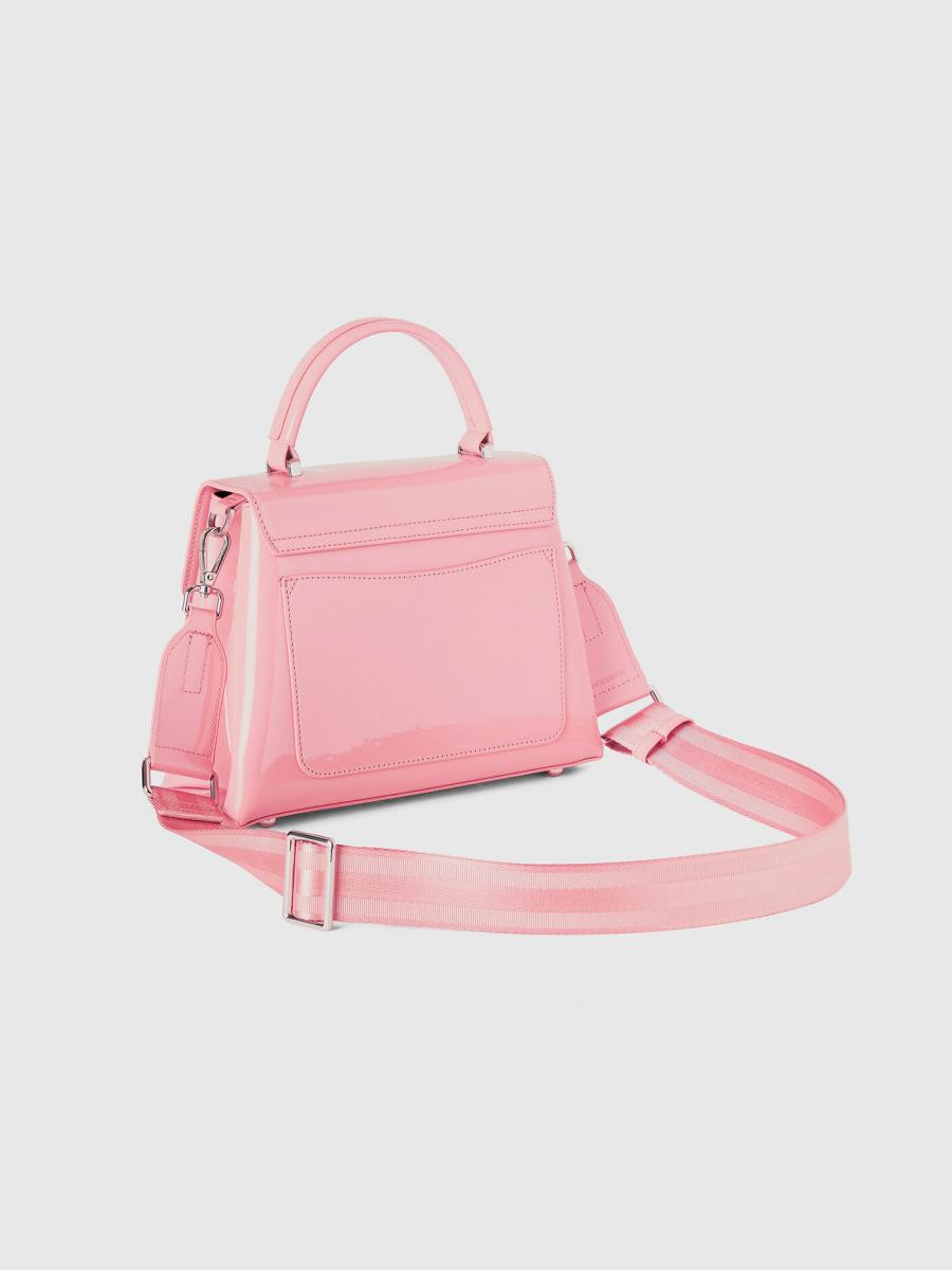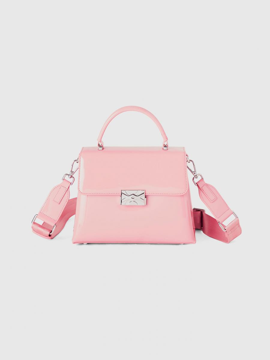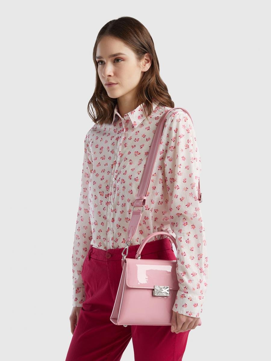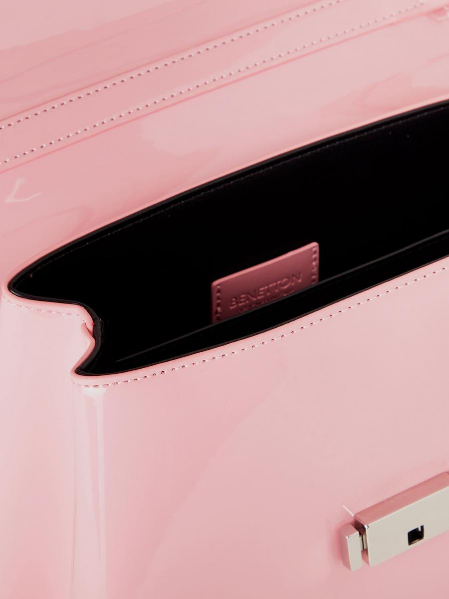 Benetton ženska srednja torbica od glatke imitacije kože sa izgledom sjajne lakirane kože. Ručka na vrhu, podesiva i uklonjiva naramenica. Prednji preklop sa metalnim zatvaračem sa logotipom. Dvostruko nošenje: rukom i preko tela. Dimenzije: 24,5*19*9 cm.