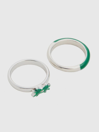 Benetton ženski set od dva metalna prstena sa zlatnom završnom obradom. Jedan prsten sa emajliranim logom, drugi sa emajliranom trakom. Svakodnevno i šareno, za dodavanje ličnog dodira svakoj odeći.