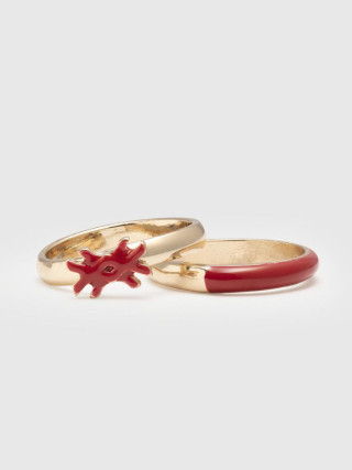 Benetton ženski set od dva metalna prstena sa zlatnom završnom obradom. Jedan prsten sa emajliranim logom, drugi sa emajliranom trakom. Svakodnevno i šareno, za dodavanje ličnog dodira svakoj odeći.
