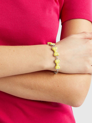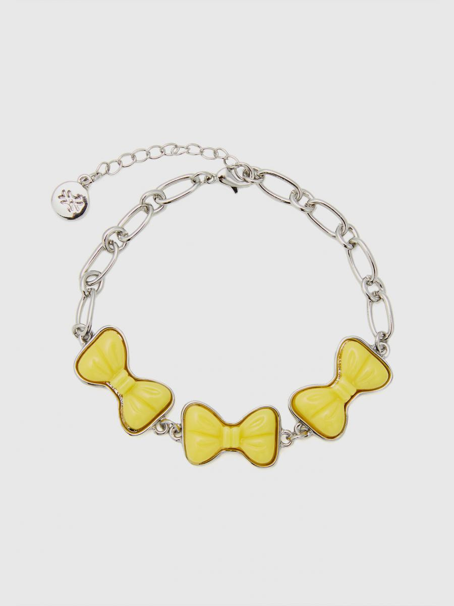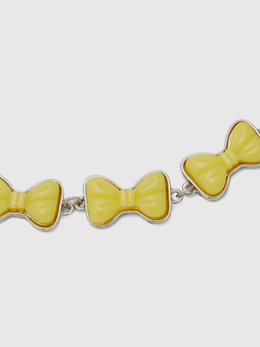Benetton ženska narukvica od metalnog lančića sa emajliranim mašnama i završnim priveskom. Srebrna završna obrada i podesivo zatvaranje na kuku. Šik i šareni komad nakita za svakodnevno nošenje.