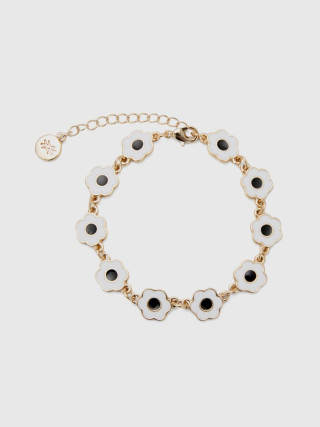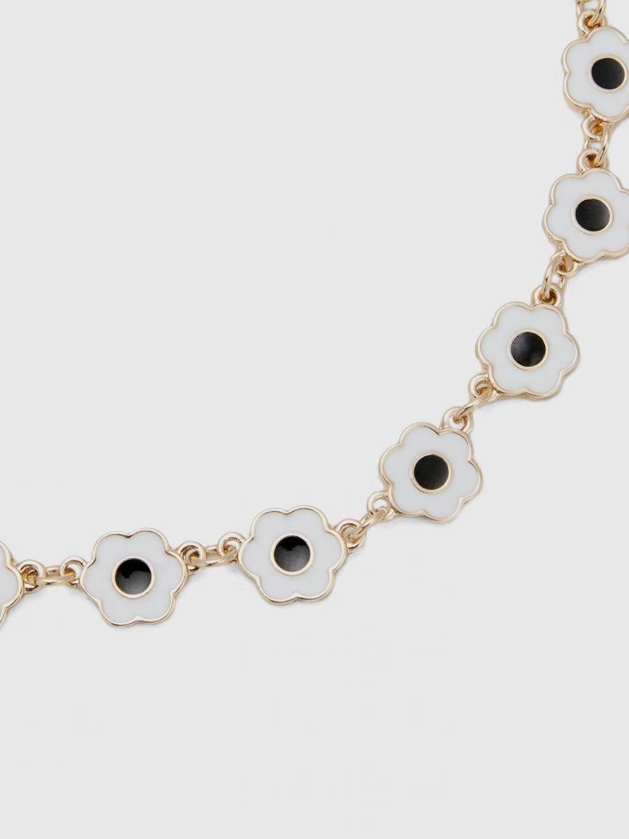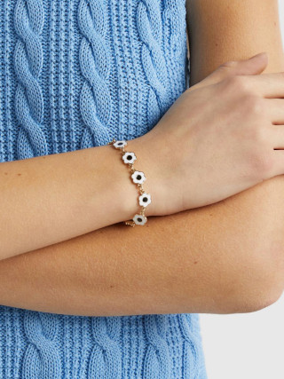 Benetton ženska narukvica od metalnog lančića sa zlatnom završnom obradom. Višebojni emajlirani cvetni privesci i podesivo zatvaranje na kuku. Šik i šareni komad nakita za svakodnevno nošenje.