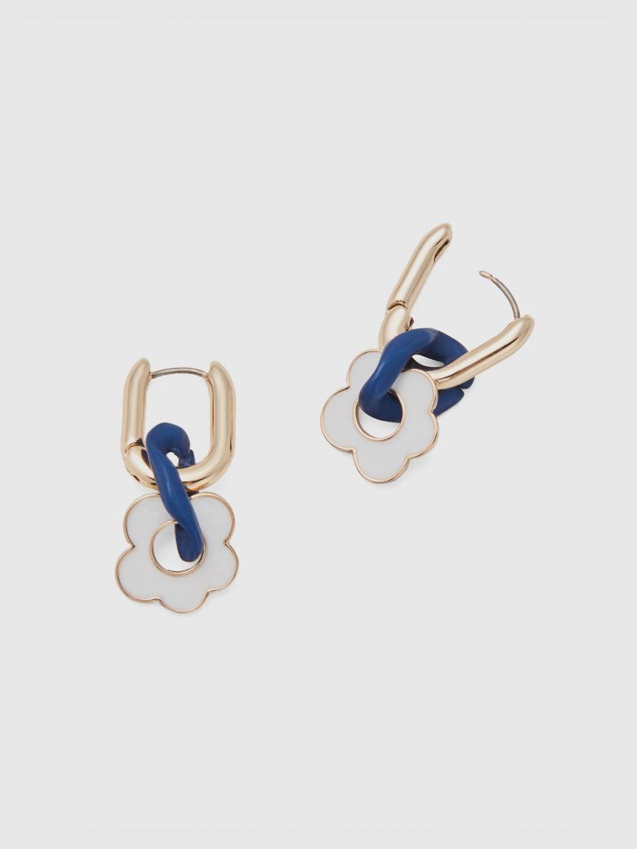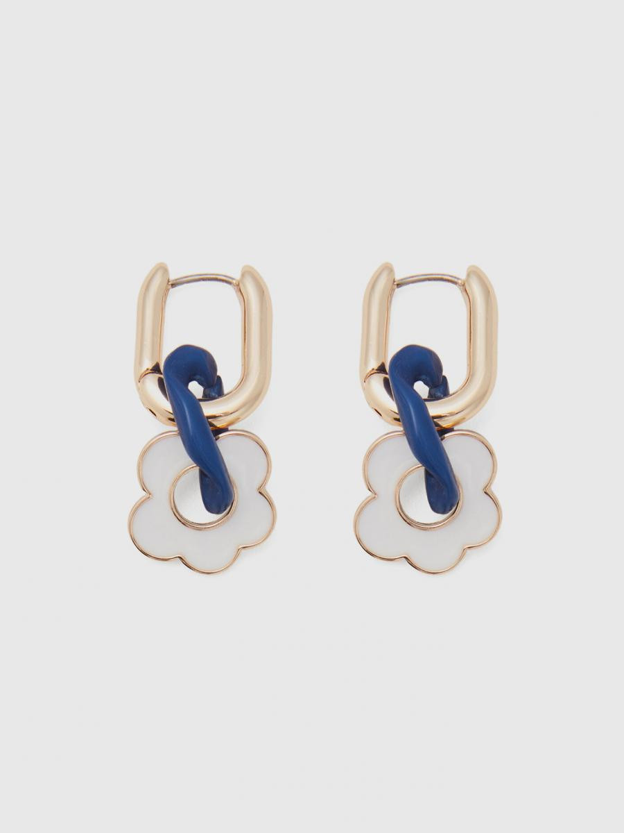 Benetton ženske minđuše od metalnog lančića sa zlatnom završnom obradom i zatvaranjem. Privezak sa belim cvetom. Idealno da svakoj odeći date dodir boje.