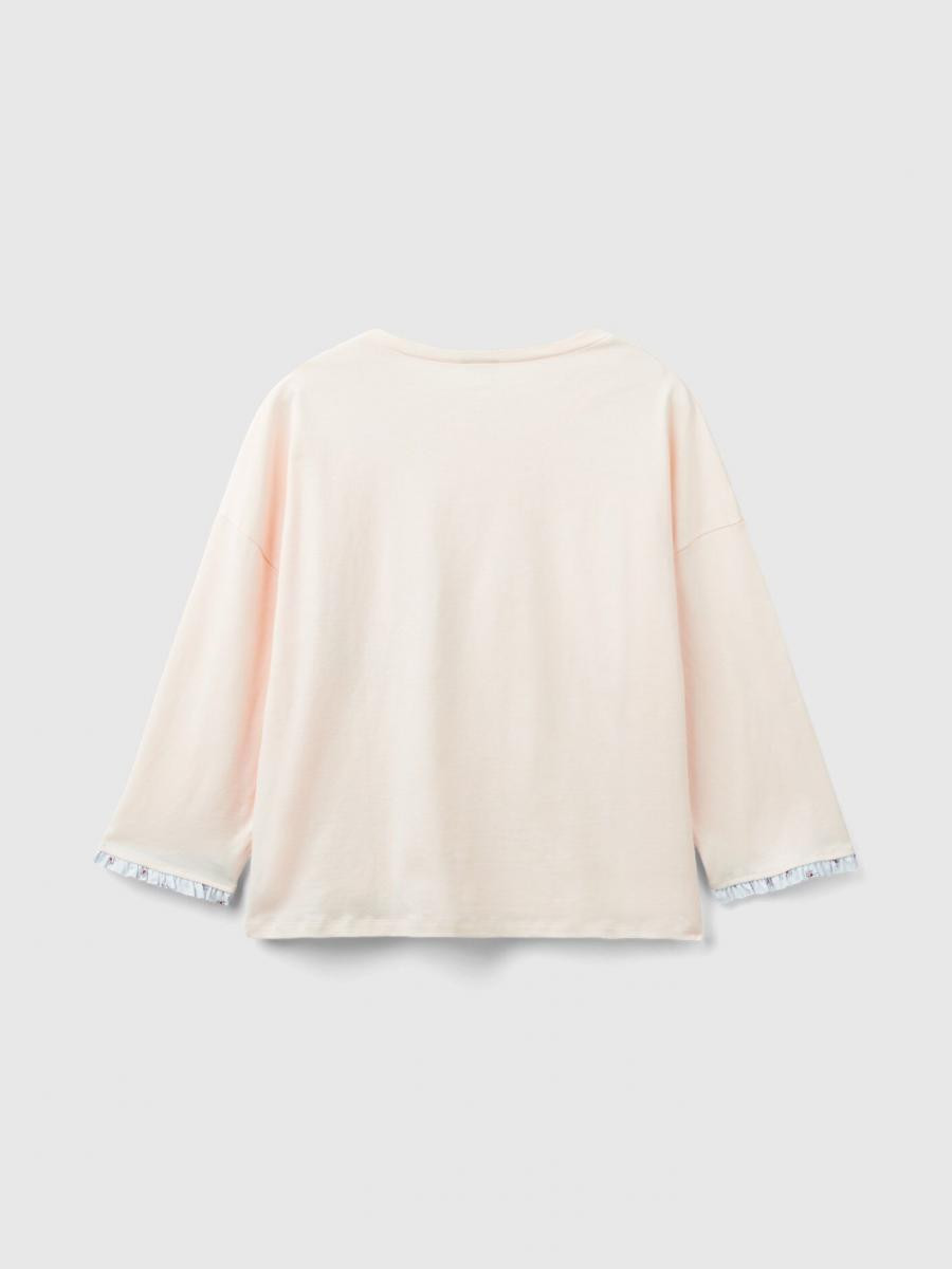 Benetton ženski gornji deo pidžame sa okruglim izrezom od mekog čistog pamuka. Rukavi 3/4 sa spuštenim ramenima, nežni volani sa štampom na bočnim stranama, velikom prednjem džepu i na kraju rukava.