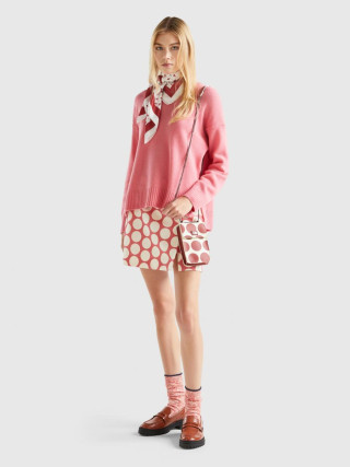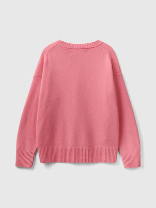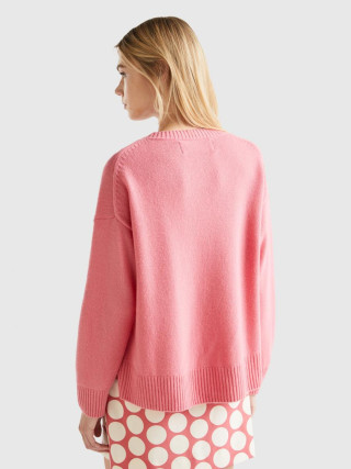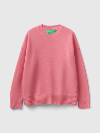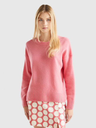 Benetton ženski džemper sa okruglim izrezom od meke mešavine vune sa boxy krojem. Dugi rukavi, spuštena ramena i prorezi sa strane. Ležeran i opušten stil, bez previše detalja.