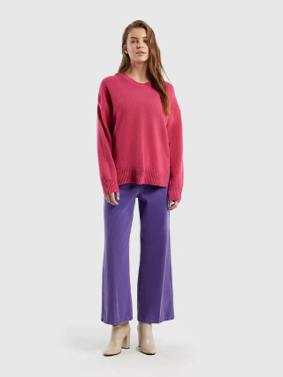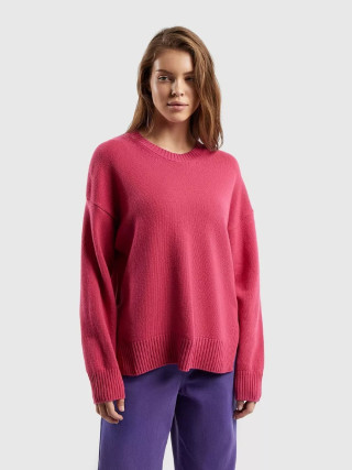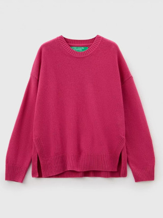 Benetton ženski džemper sa okruglim izrezom od meke mešavine vune sa boxy krojem. Dugi rukavi, spuštena ramena i prorezi sa strane. Ležeran i opušten stil, bez previše detalja.