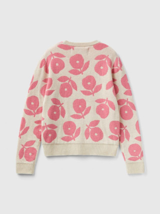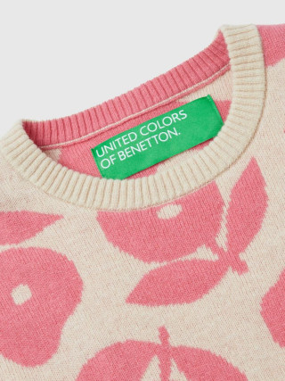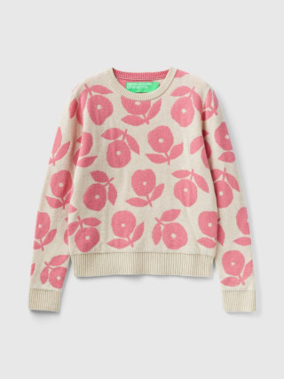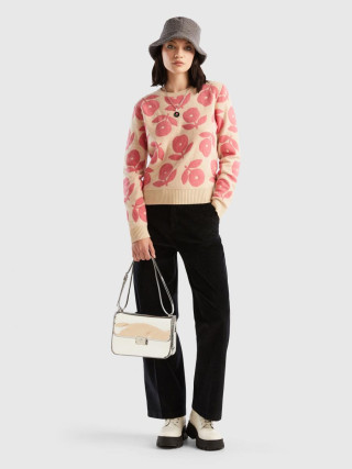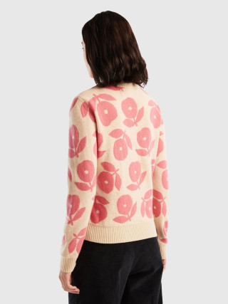 Benetton ženski džemper dugih rukava sa okruglim izrezom od mekog vunenog prediva. Umetnuti cvetni motiv u kontrastnoj boji.
