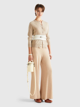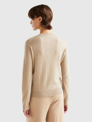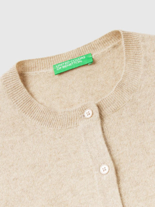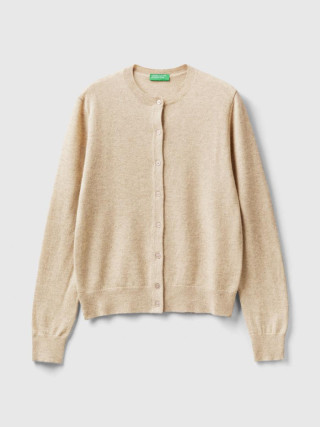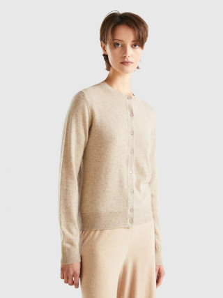 Benetton ženski kardigan dugih rukava sa okruglim izrezom, regular fit kroja, prednjim kopčanjem na dugmiće. Napravljen od vrhunskog 100% italijanskog kašmirskog prediva, slabog i prijatnog na dodir, koji održava toplotu i nudi toplotnu izolaciju.