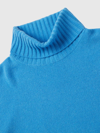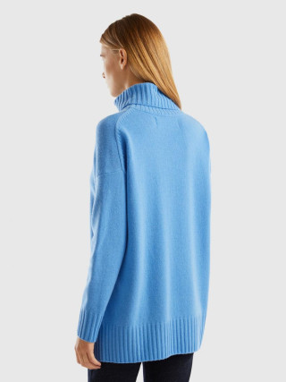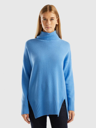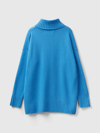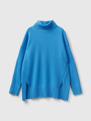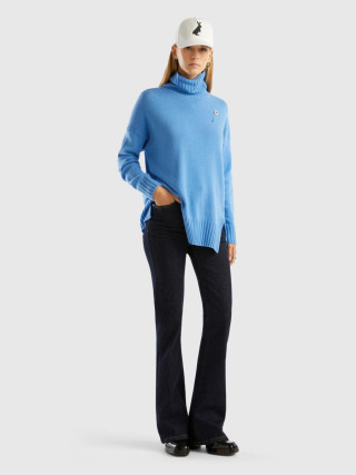 Benetton ženski džemper od meke mešavine vune opuštenog kroja. Visok vrat, dugi rukavi i prorezi sa strane. Ovaj proizvod je napravljen na održiv način zahvaljujuc´i projektu VASATEKS, koji omoguc´ava da se voda iz proizvodnog ciklusa povrati i ponovo koristi u narednim procesima.