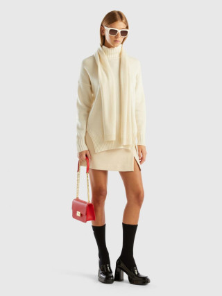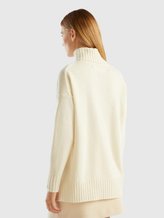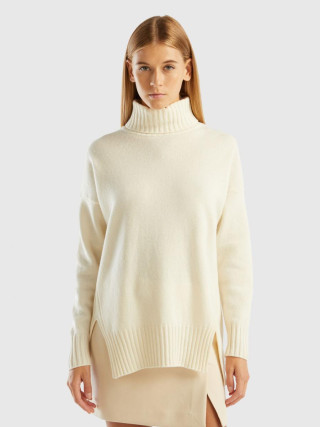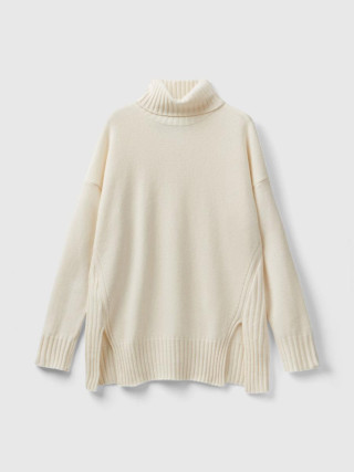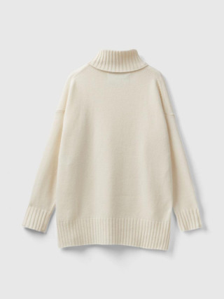 Benetton ženski džemper od meke mešavine vune opuštenog kroja. Visok vrat, dugi rukavi i prorezi sa strane. Ovaj proizvod je napravljen na održiv način zahvaljujuc´i projektu VASATEKS, koji omoguc´ava da se voda iz proizvodnog ciklusa povrati i ponovo koristi u narednim procesima.
