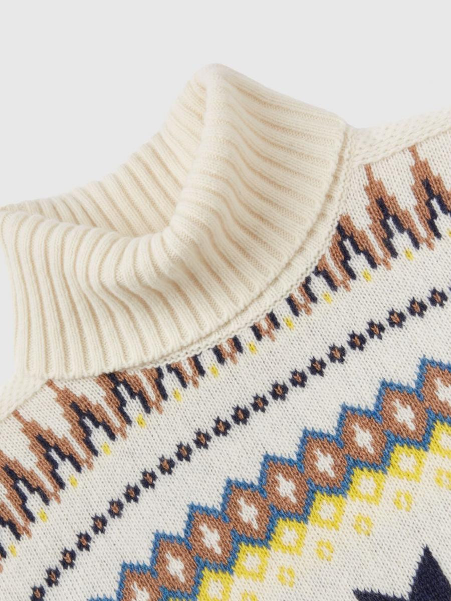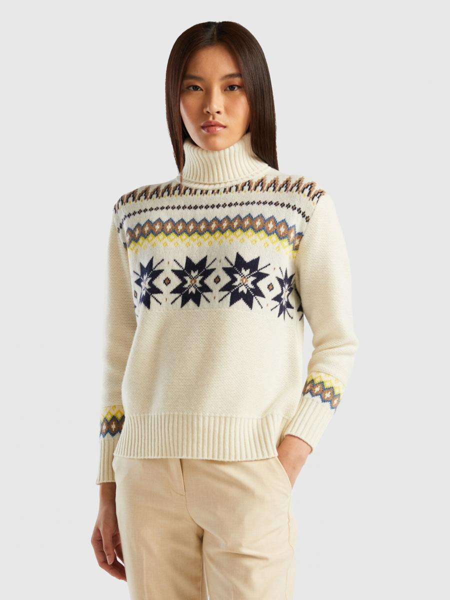 Benetton ženski džemper sa visokim okovratnikom od mekog vunenog prediva. Dugi rukavi i spuštena ramena. Posebno žakar pletenje sa nordijskim inspirisanim geometrijskim motivima. Odec´a sa prijatnim zimskim vibracijama.
