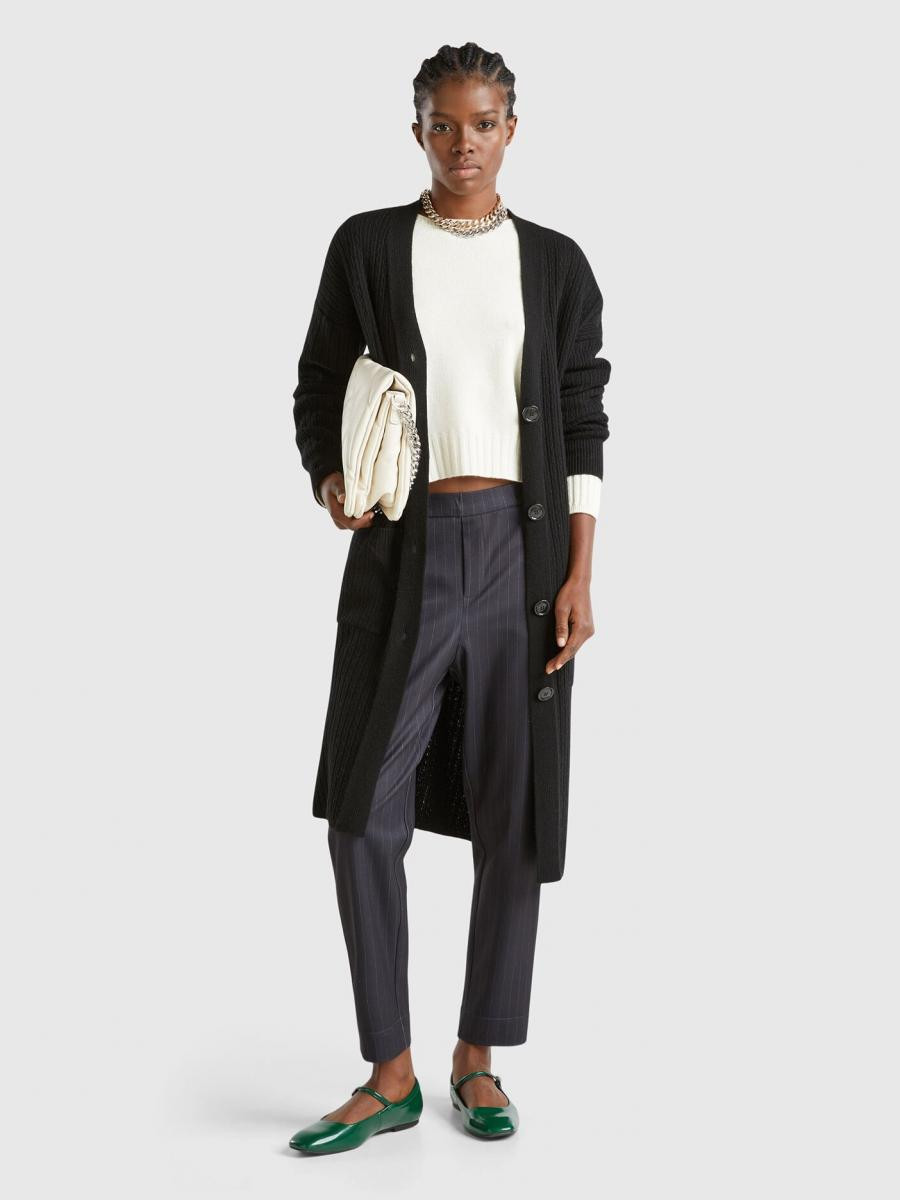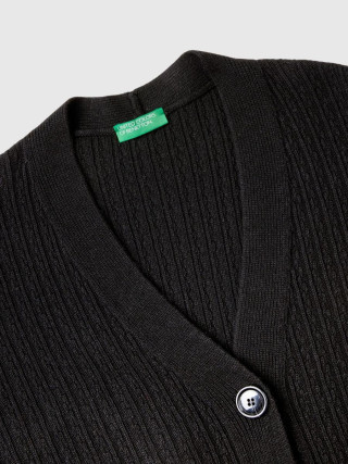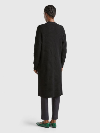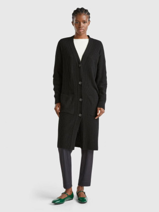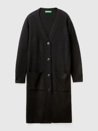 Benetton ženski dugacki kardigan od meke vune i viskoznog prediva. V-izrez, prednje kopcanje sa dugmadima i prednjim našivenim džepovima. Mekan i topao, savršena kao dodatni sloj.