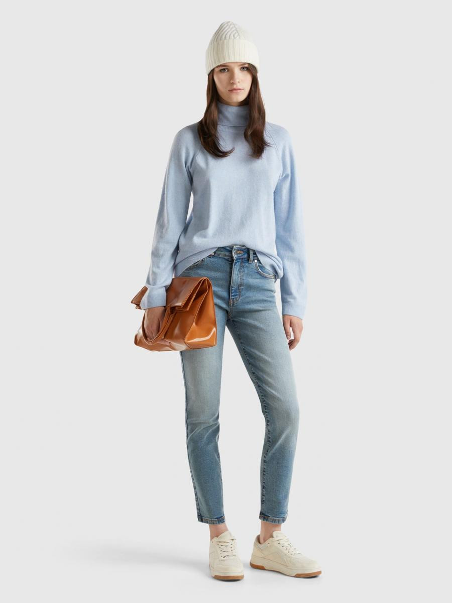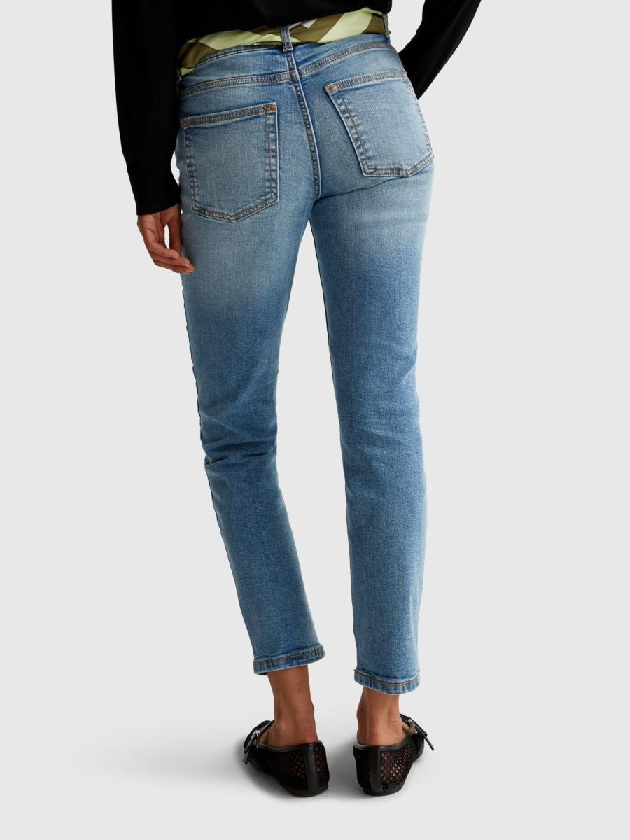 Benetton ženske pantalone visokog struka od rastegljivog recikliranog pamučnog teksasa. Slim fit model, mekši i krac´i pri dnu. Dizajn sa pet džepova i praktično otvaranje na patent zatvarač i dugme.