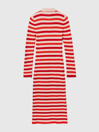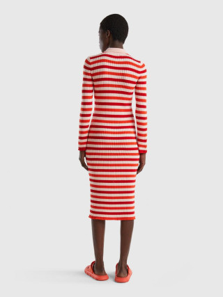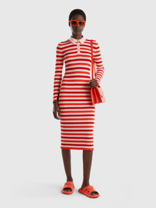 Benetton ženska midi haljina, rebrasta i pletena od mekog triko pamuka sa uskim krojem. Polo kragna, delimični prednji otvor sa tri dugmeta, dugi rukavi sa prorezima na zglobu.