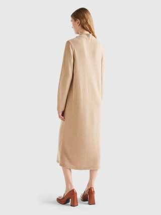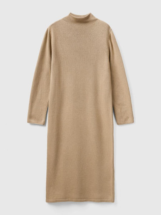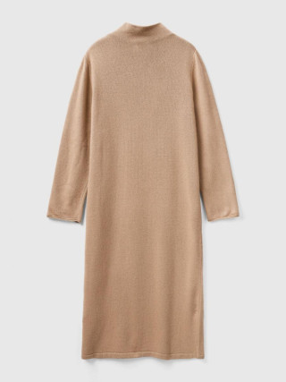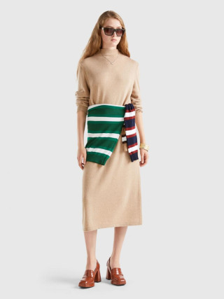 Benetton ženska haljina dugih rukava od tople mešavine vune, viskoze i kašmira. Midi dužine, suženog i opuštenog kroja. Okovratnik, zavrtanje na izrezu i na kraju rukava. Udobna i svestrana, savršene za slobodno vreme.