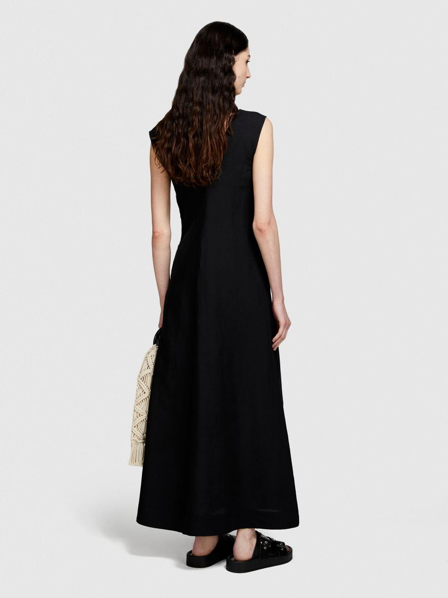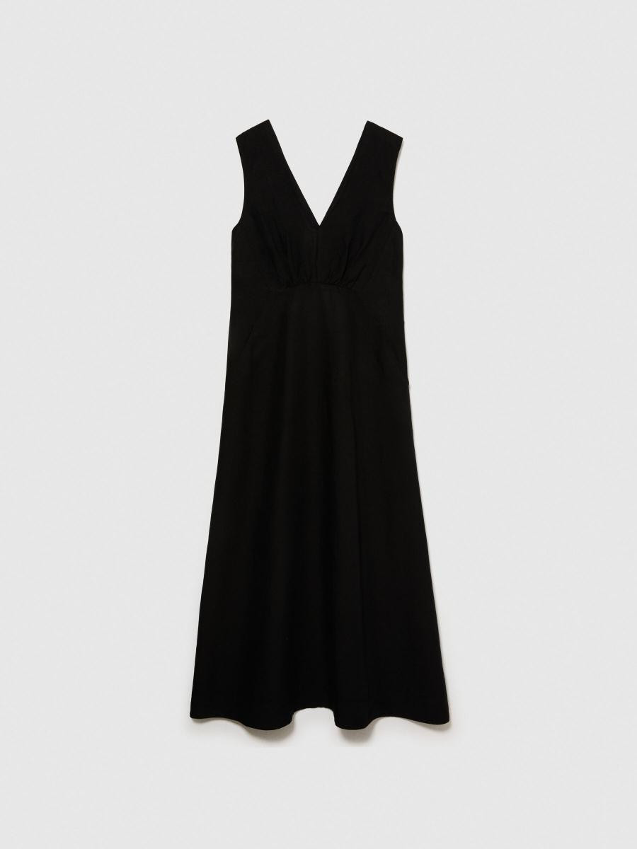Sisley ženska haljina bez rukava od mešavine lana i viskoze, sa V-izrezom, izrezana ispod grudi gde počinje duga suknja u obliku trapeza. Dva džepa uvučena sa strane i bočni patent zatvarač.