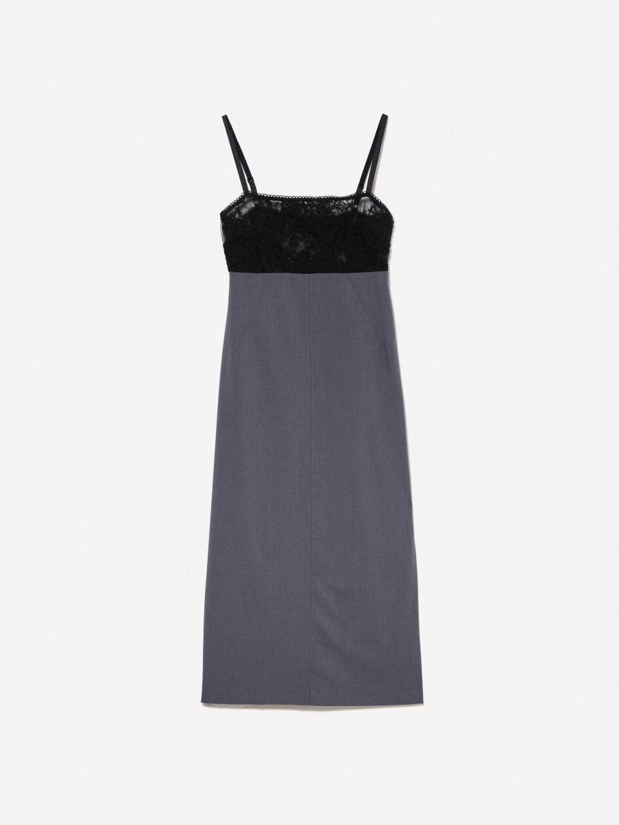 Sisley ženska midi haljina od mešavine viskoze i vune. Poprsje od vezenog tila, podesive tanke naramenice, nevidljivi patent zatvarač sa strane i bočni prorez.