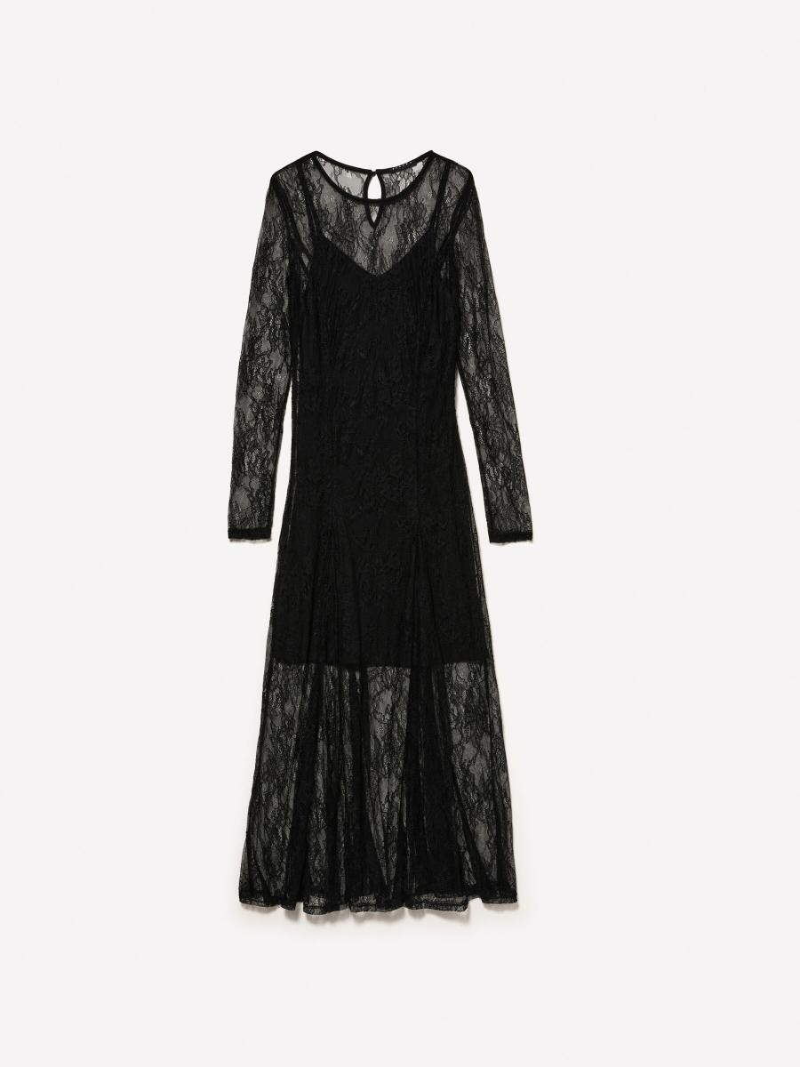 Sisley ženska haljina od vezene čipke na tilu, sa jednobojnim slip-om. Kružni izrez, otvor za ključaonicu zatvoren malim dugmetom na leđima, dugi rukavi i blago prošireni porub.