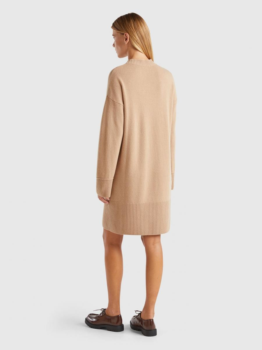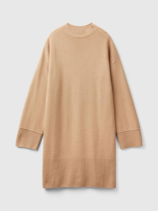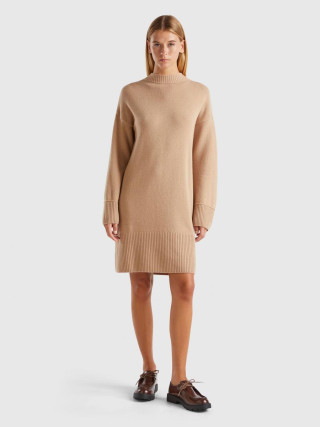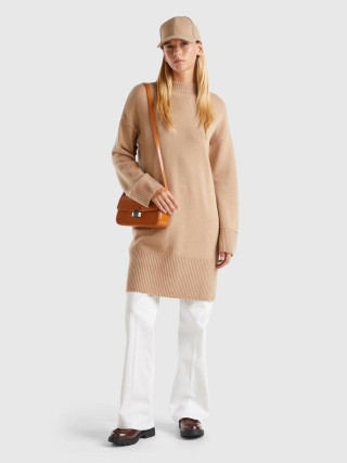 Benetton ženska haljina sa visokom kragnom od mekog vunenog prediva. Opuštenog kroja sa dugim suženim rukavima i spuštenim ramenima, dužine iznad kolena. Ležerno-šik alternativa klasičnom vunenom džemperu.