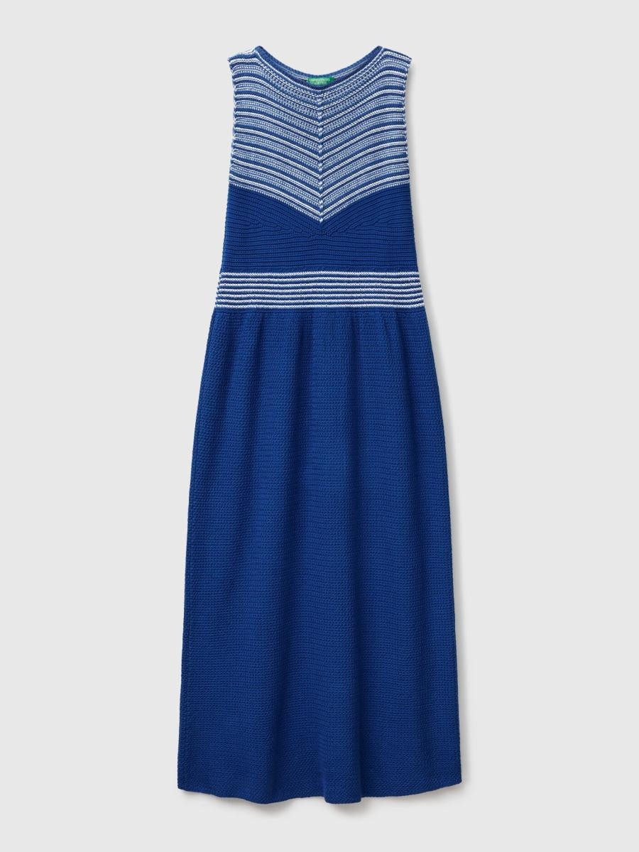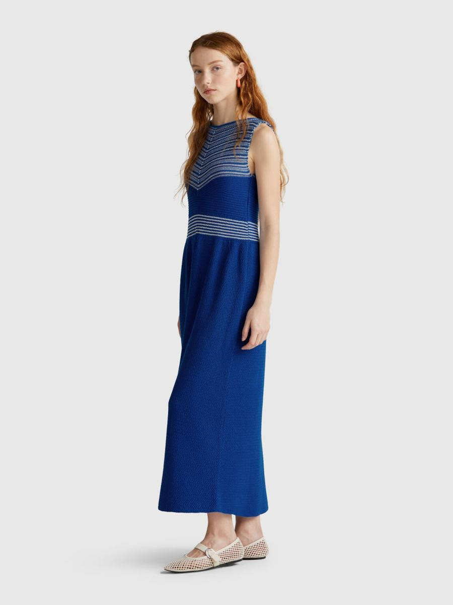 Benetton trikotažna duga haljina, pletena u dvostrukom mah bodu. Gornji deo bez šavova sa izrezom u obliku čamca, izrađen u kombinaciji bodova sa efektom heklanja. Na gornjem delu pruge u šari riblje kosti, dok su u predelu struka horizontalne.