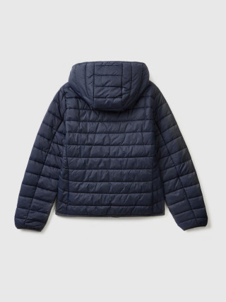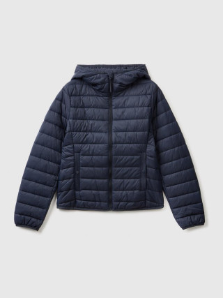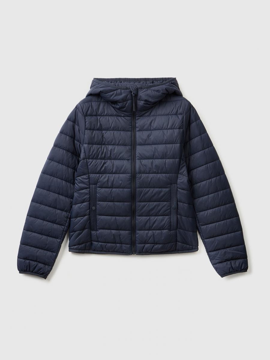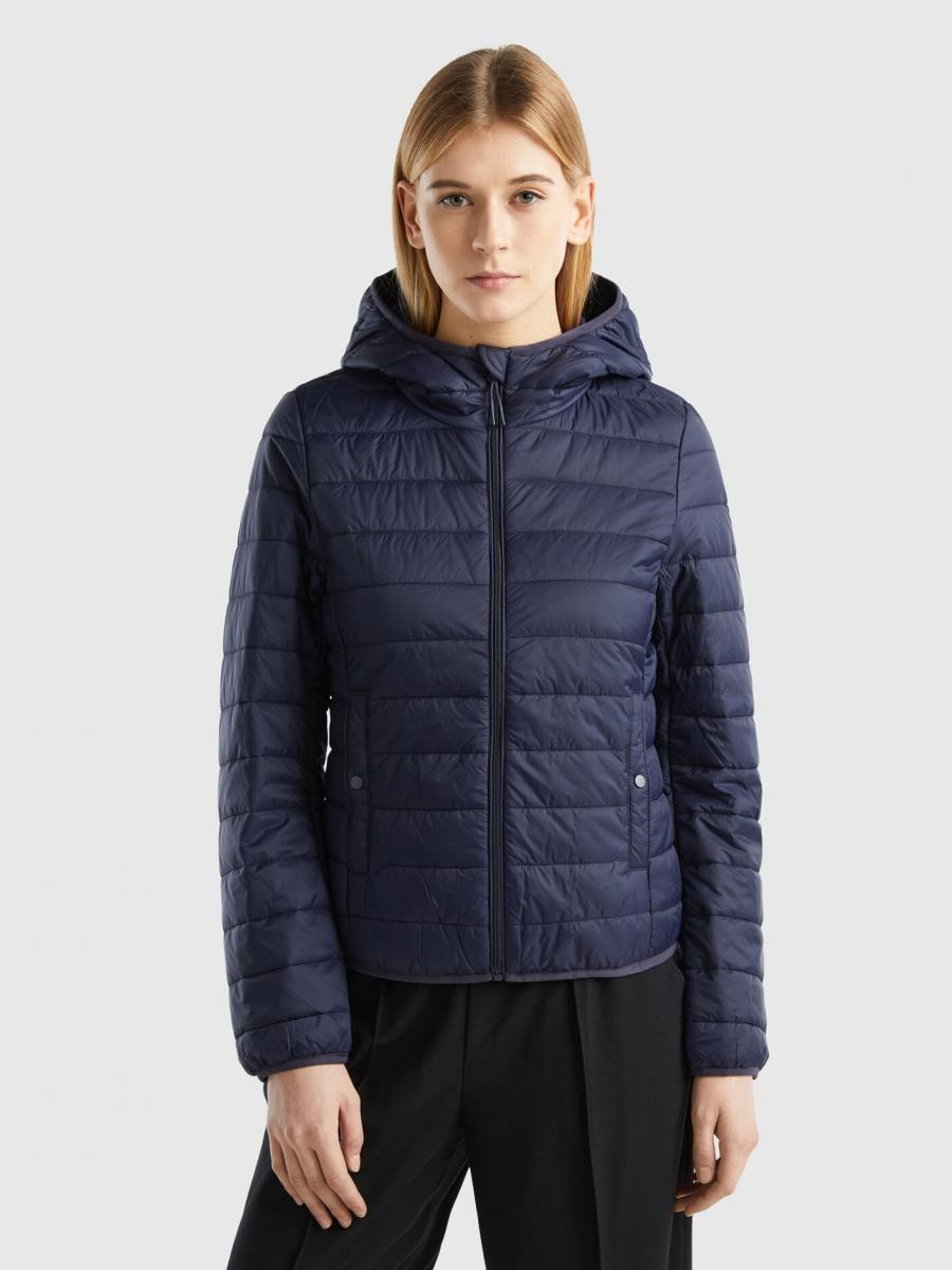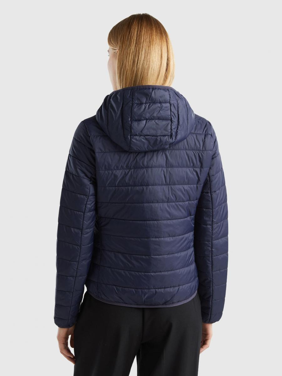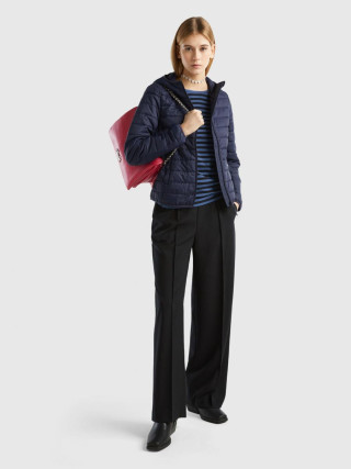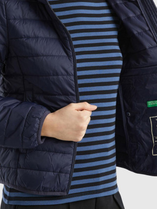 Benetton ženska pufer jakna sa kapuljačom od najlona Rain Defender i normalnog kroja. Kopčanje napred sa patentnim zatvaračem do brade, prednji džepovi sa dugmetom. Topla, ali lagana podloga od reciklirane vate, proizvedena od PET plastičnih boca. Savršeno kako se godišnja doba menjaju.