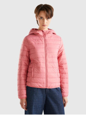 Benetton ženska pufer jakna sa kapuljačom od najlona Rain Defender i normalnog kroja. Kopčanje napred sa patentnim zatvaračem do brade, prednji džepovi sa dugmetom. Topla, ali lagana podloga od reciklirane vate, proizvedena od PET plastičnih boca. Savršeno kako se godišnja doba menjaju.