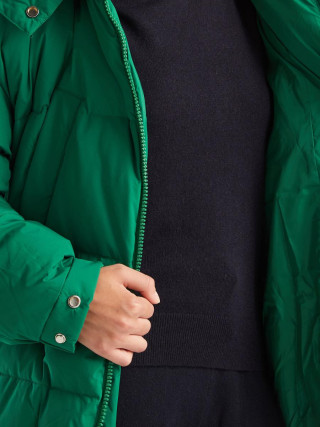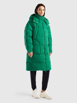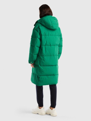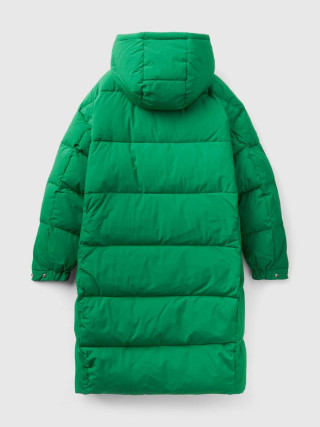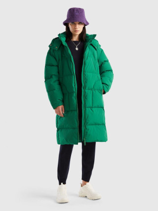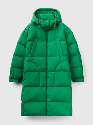 Benetton ženska puf jakna od tehničke tkanine Rain defence sa horizontalnim šavovima. Opremljena praktičnom kapuljačom sa vezicom i kopčom. Visok vrat i zatvarač sa rajsferšlusom i dvostrukim patentnim zatvaračem koji se povlači do brade. Bočni džepovi sa skrivenim patent zatvaračem i džepovi na grudima sa dugmetom. Topla i udobna, podstavljena je pravim recikliranim paperijem, savršena za hladnije mesece.
