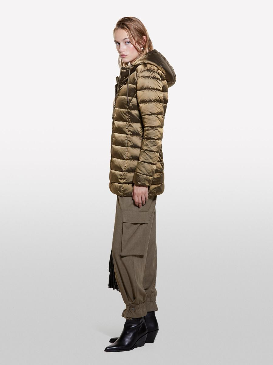 Sisley ženska podstavljena jakna od satenskog najlona sa horizontalnim šavovima. Kapuljača sa vezicom, prednje kopčanje sa dvostrukim patentnim zatvaračem i dva džepa umetnuta sa strane.