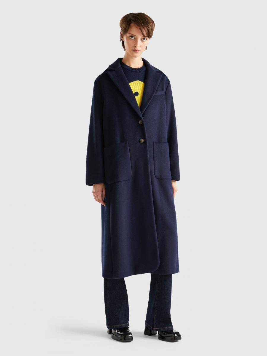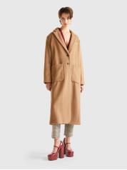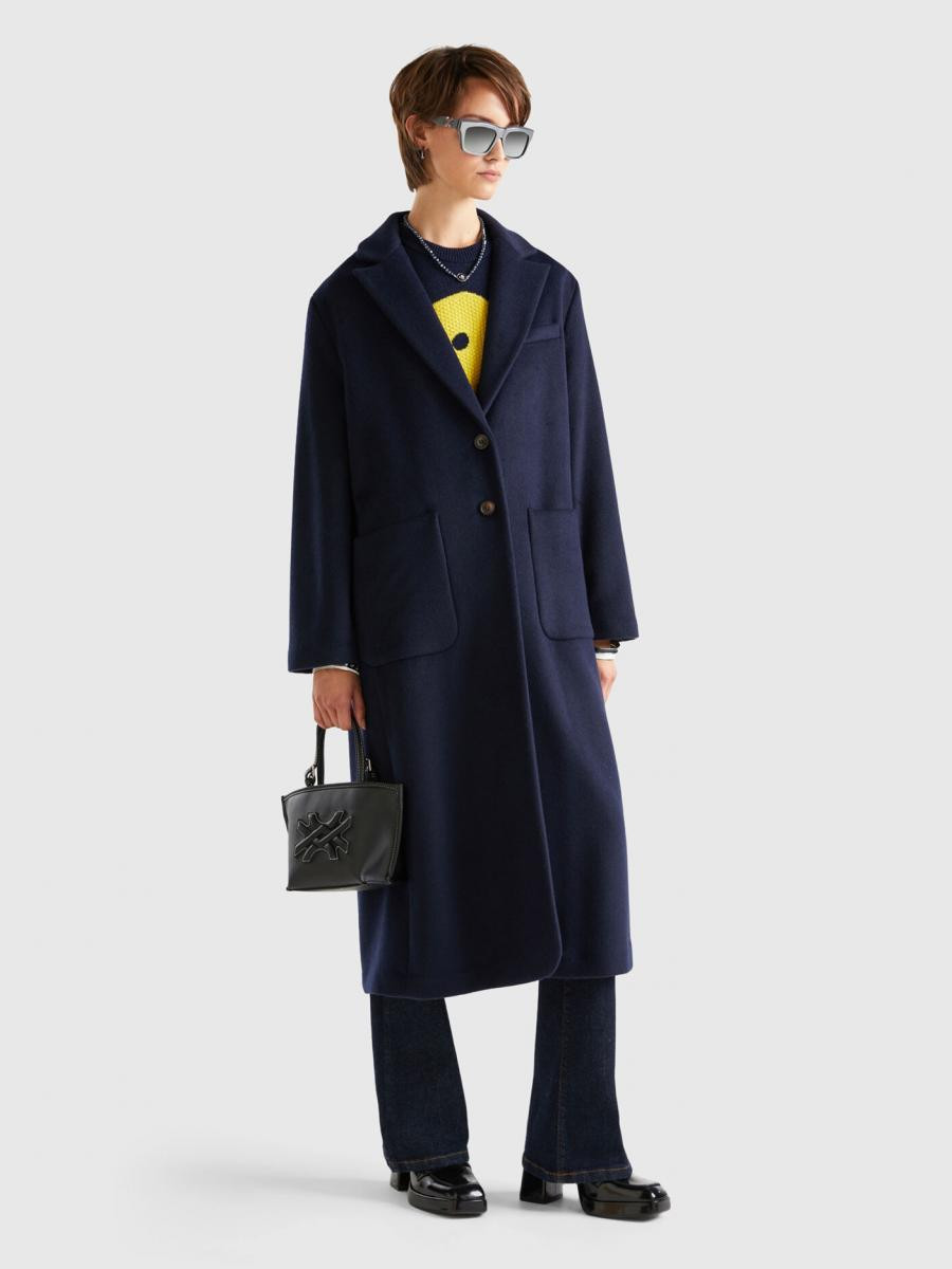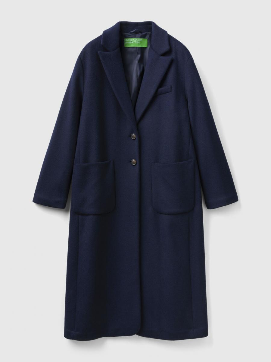 Benetton ženski kaput podstavljen od tople mešavine šetlandske vune i lajosela. Klasična kragna sa reverom, kopčanje na dva dugmeta, našiveni džepovi na prednjoj strani.