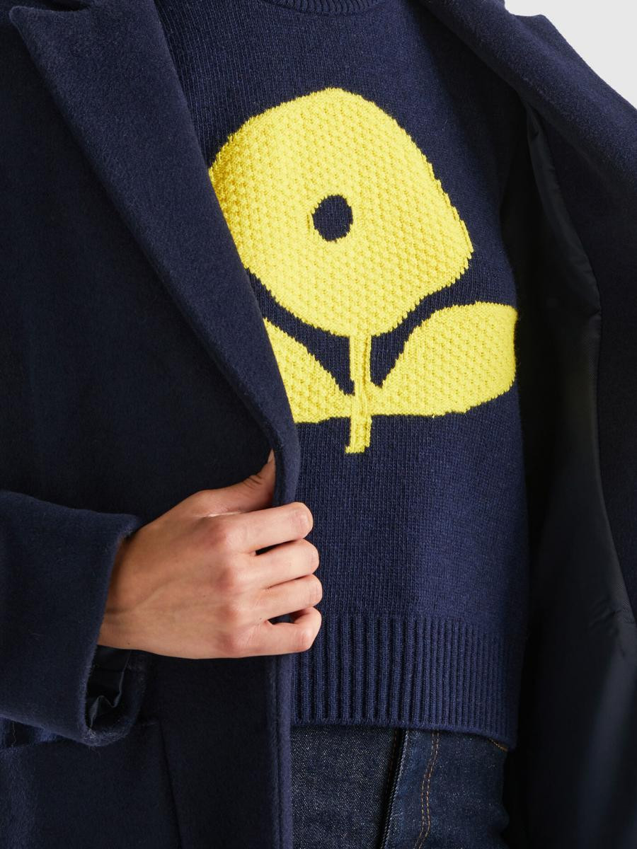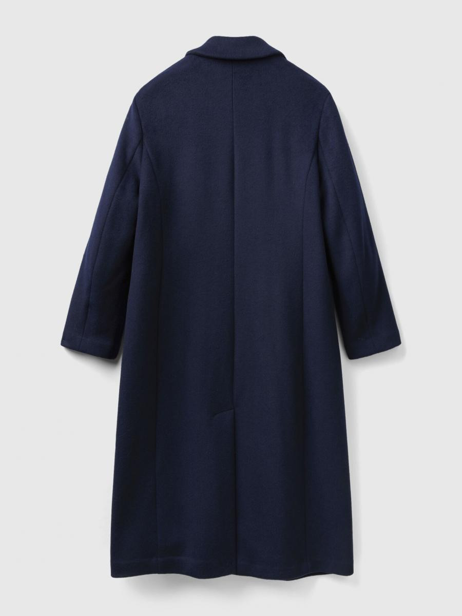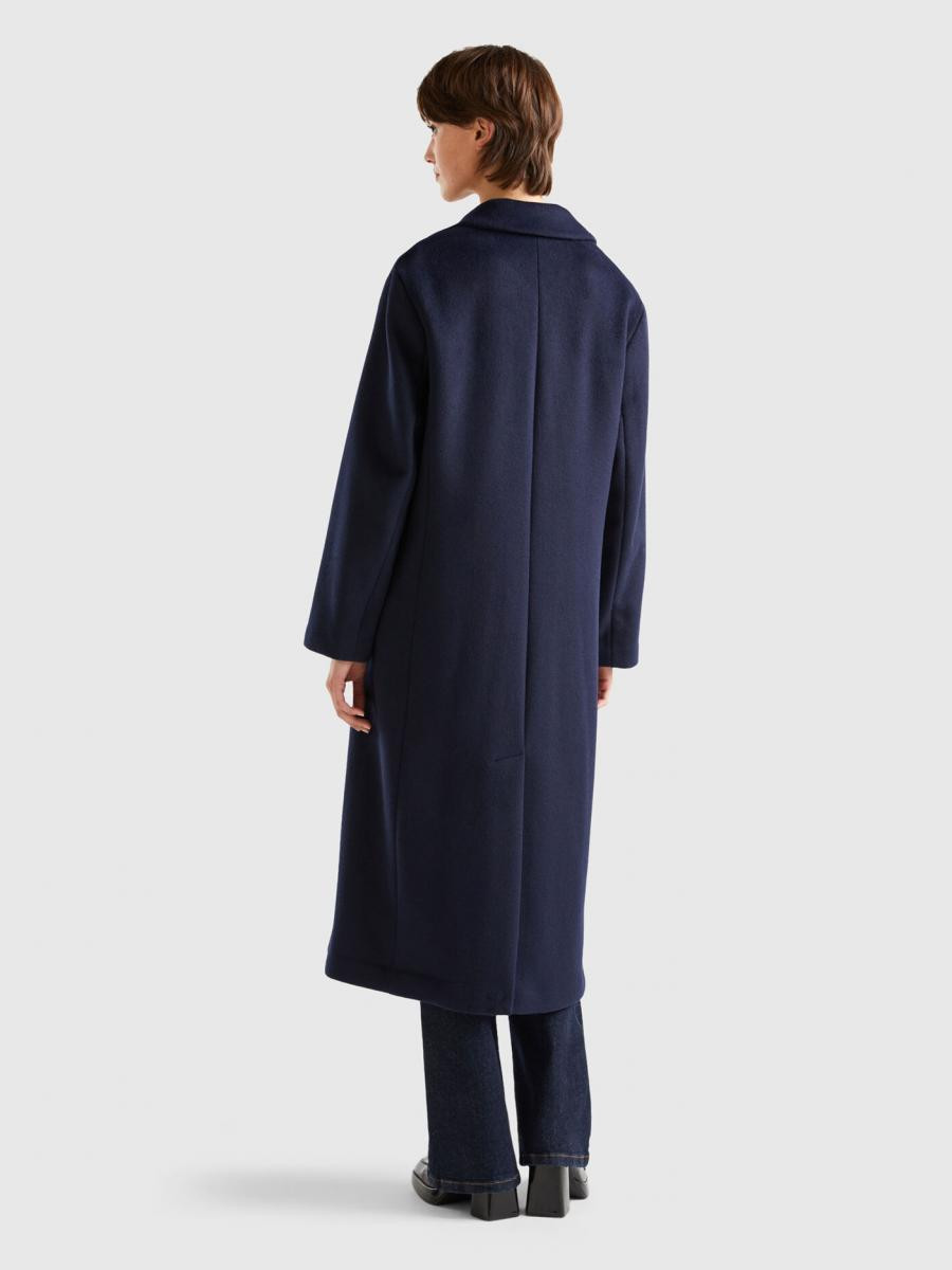 Benetton ženski kaput podstavljen od tople mešavine šetlandske vune i lajosela. Klasična kragna sa reverom, kopčanje na dva dugmeta, našiveni džepovi na prednjoj strani.