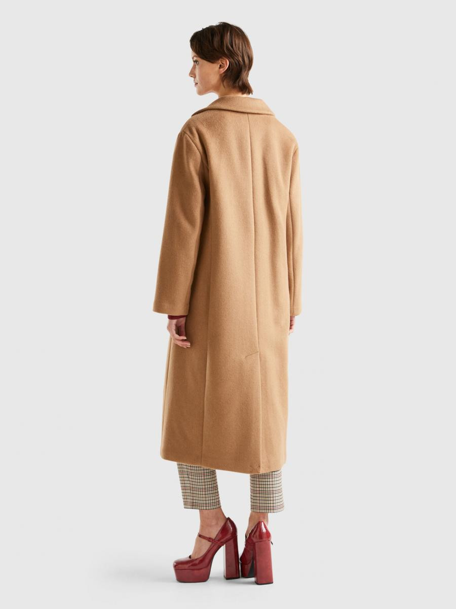 Benetton ženski kaput podstavljen od tople mešavine šetlandske vune i lajosela. Klasična kragna sa reverom, kopčanje na dva dugmeta, našiveni džepovi na prednjoj strani.