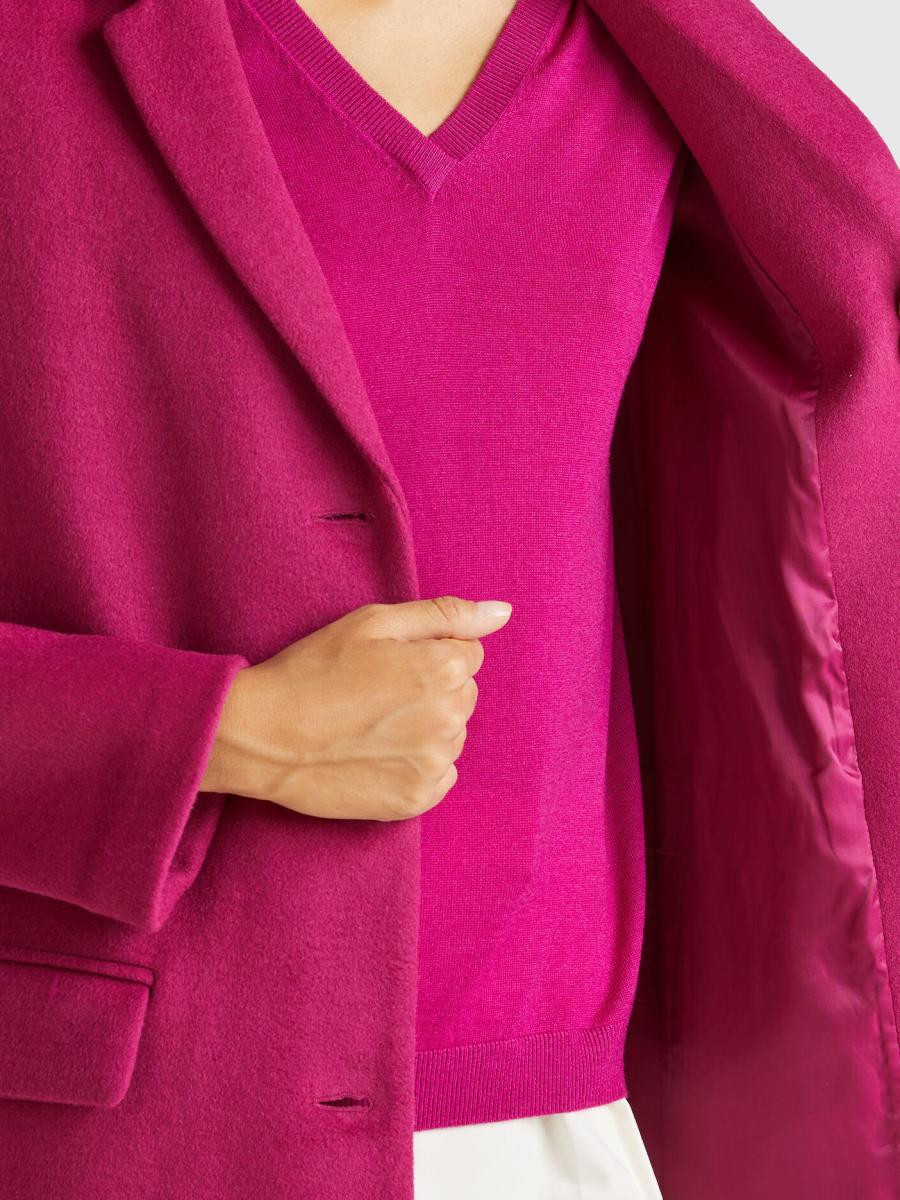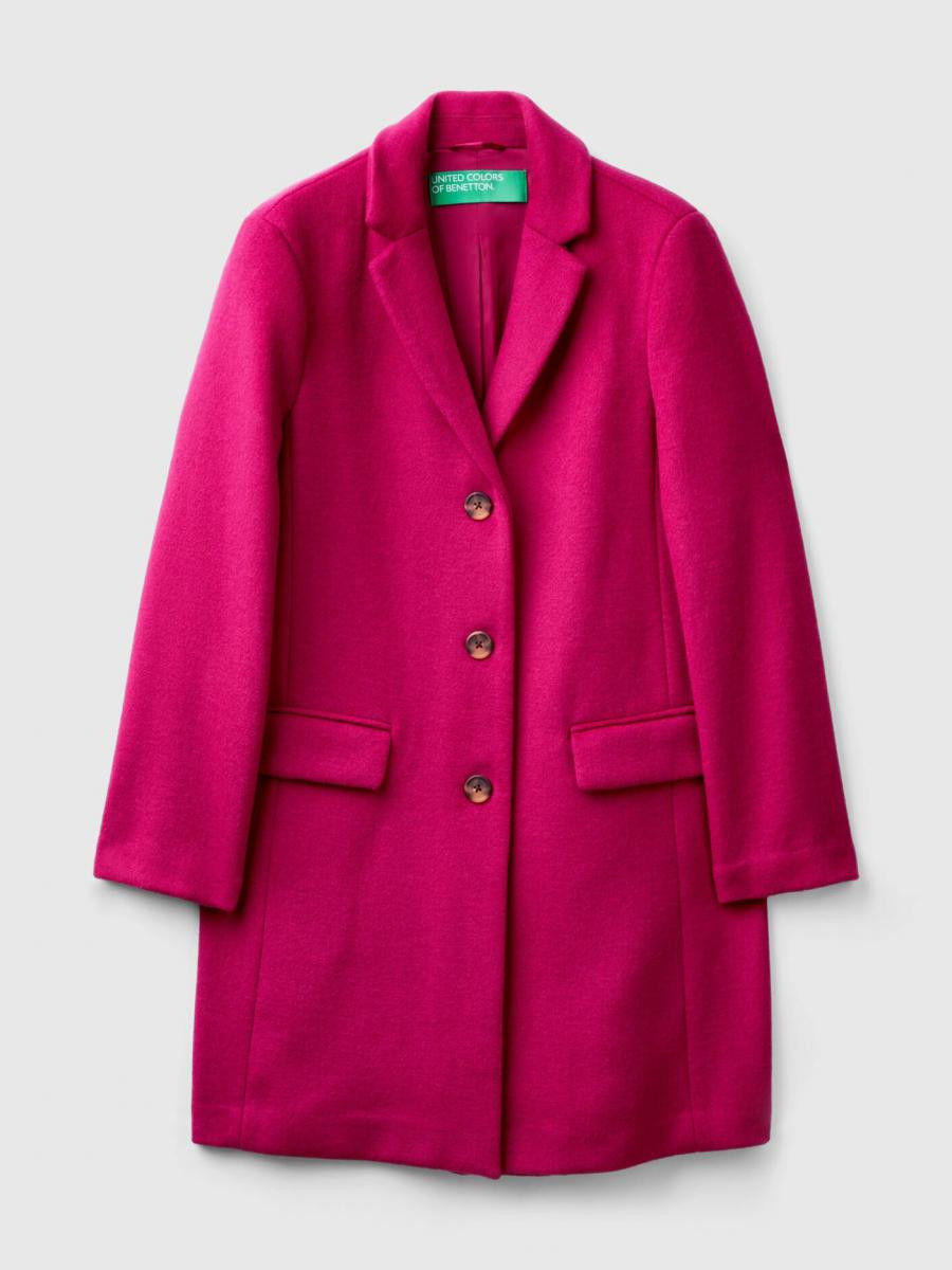 Benetton ženski kaput od mešavine vune i viskoze, podstavljen mešavinom viskoze. Ravnog kroja i dužine iznad kolena. Klasični dekolte sa reverom, kopčanjem na dugmad i džepovima sa preklopom sa strane. Dovoljno formalno, pogodno i za kancelariju.