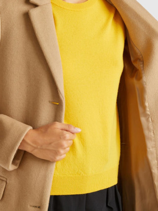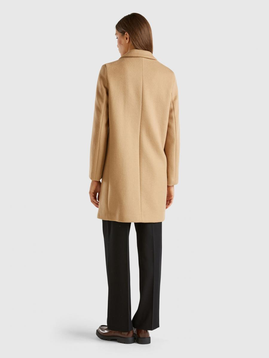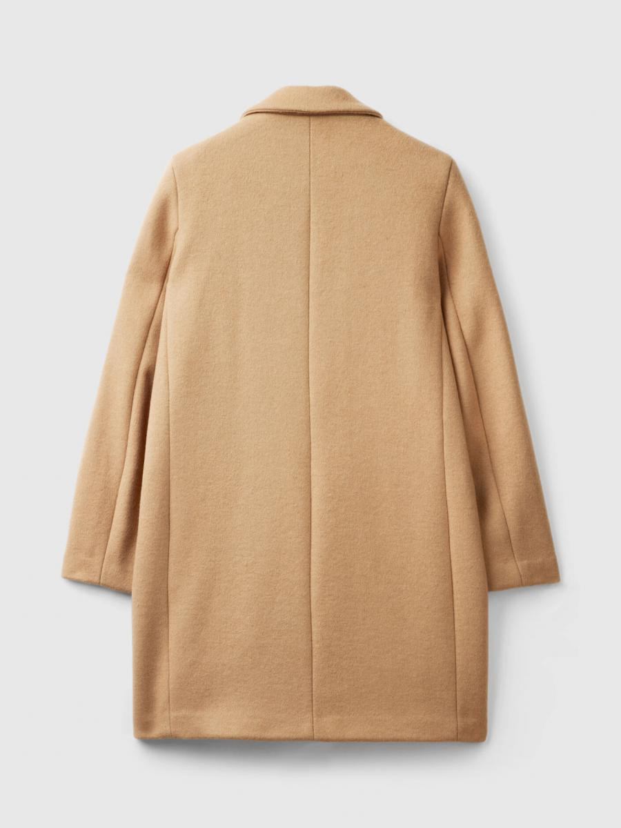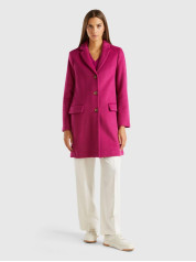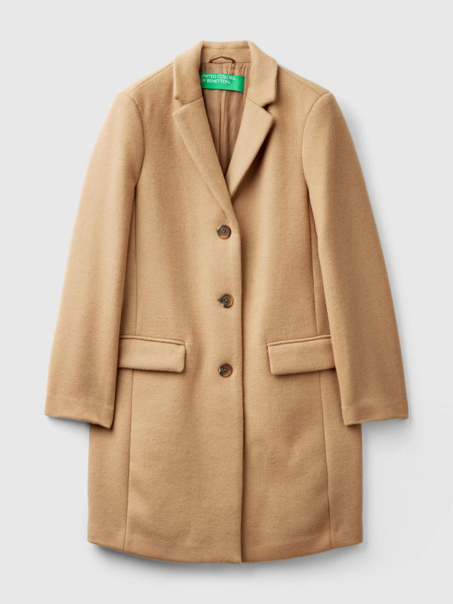 Benetton ženski kaput od mešavine vune i viskoze, podstavljen mešavinom viskoze. Ravnog kroja i dužine iznad kolena. Klasični dekolte sa reverom, kopčanjem na dugmad i džepovima sa preklopom sa strane. Dovoljno formalno, pogodno i za kancelariju.