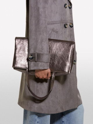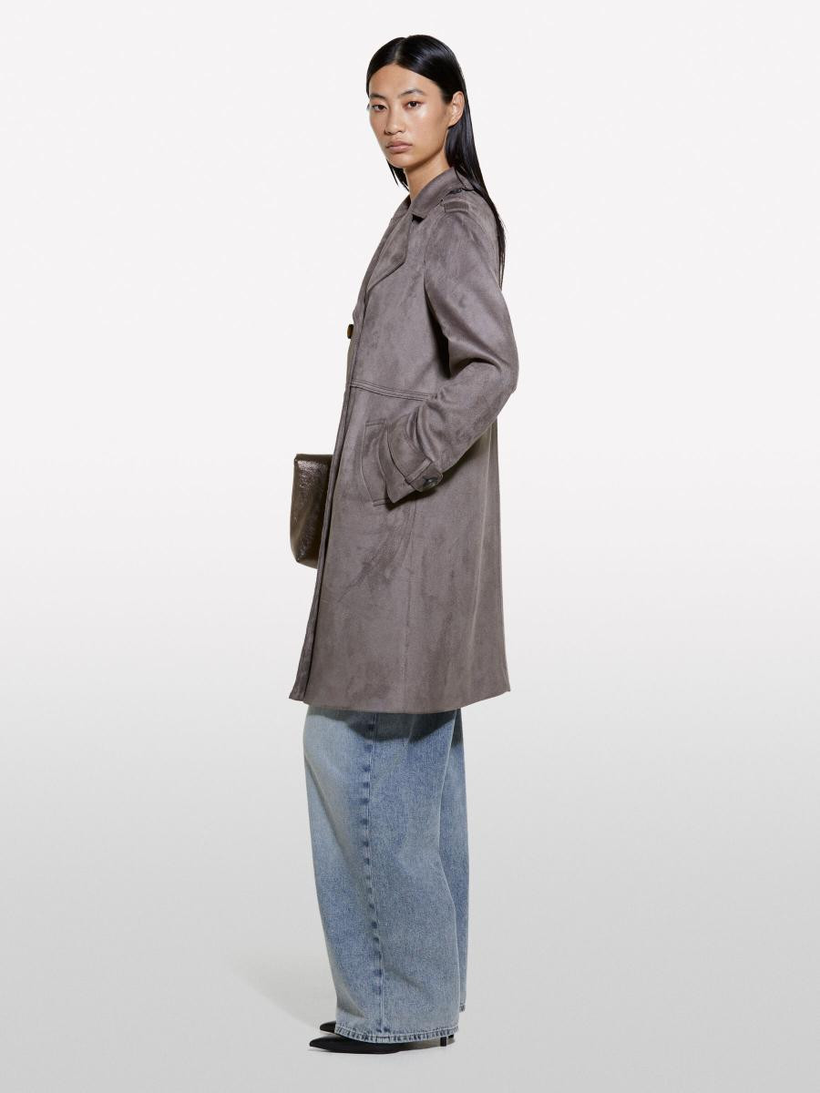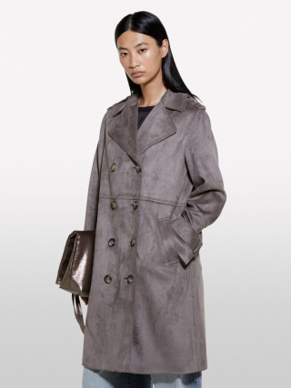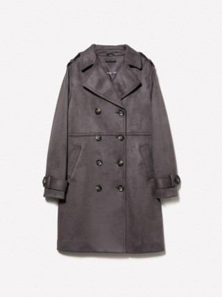 Sisley ženski kaput od veštačkog antilopa, sa rezom u struku i vidljivim šavovima. Zaobljeni reveri, zatvaranje na duplo kopčanje, dugi rukavi sa epoletama na ramenima i kaiševima na zglobovima, dva prednja džepa sa cevčicama i sirovo rezani porub.