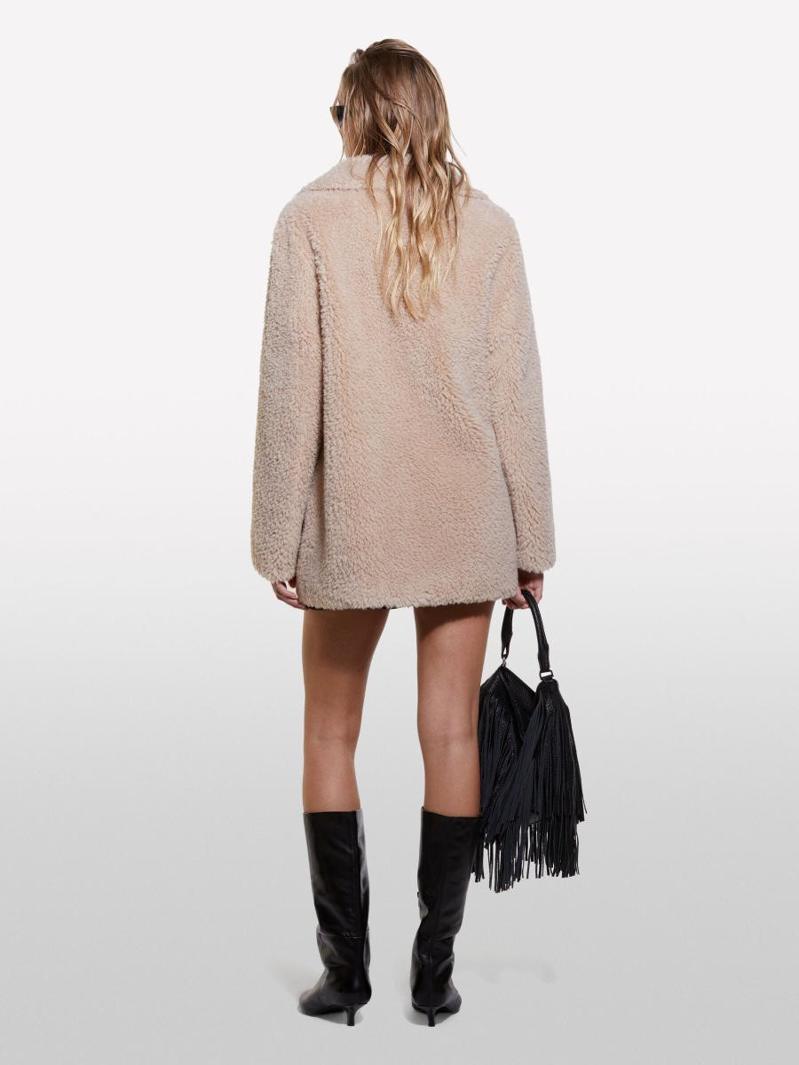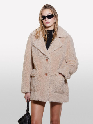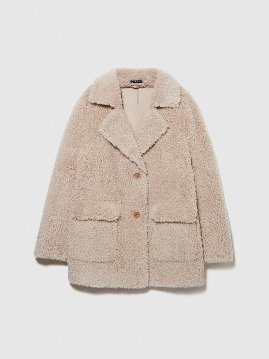Sisley ženski kratki kaput od mekog veštackog krzna. Široki rever, jednoredno kopcanje i dva maksi džepa sa preklopima.