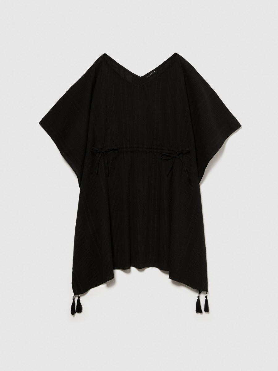 Sisley ženski kaftan od 100% pamučnog krepa, sa V-izrezom, kovrčama na sredini naprijed i resicama na dnu.