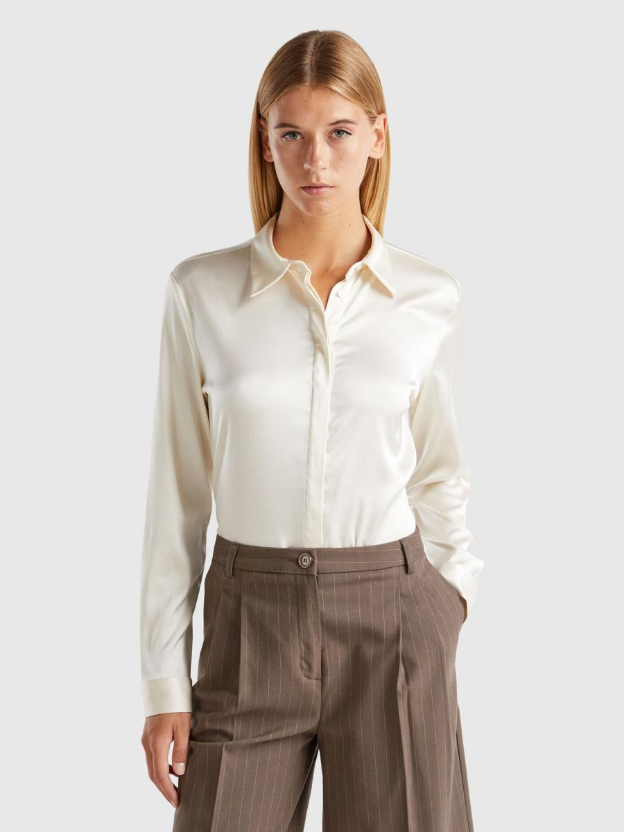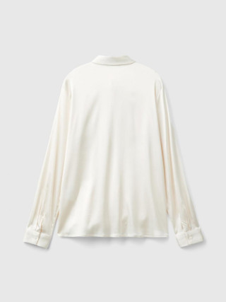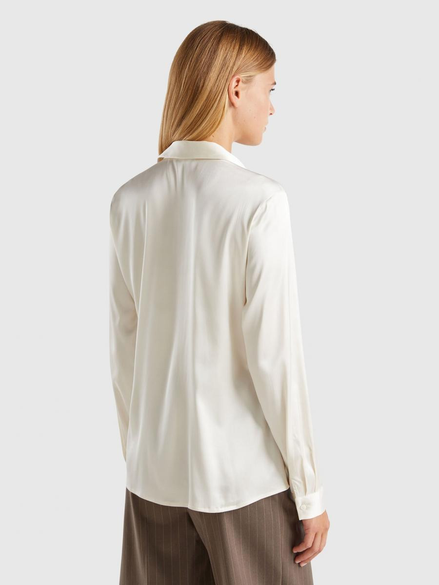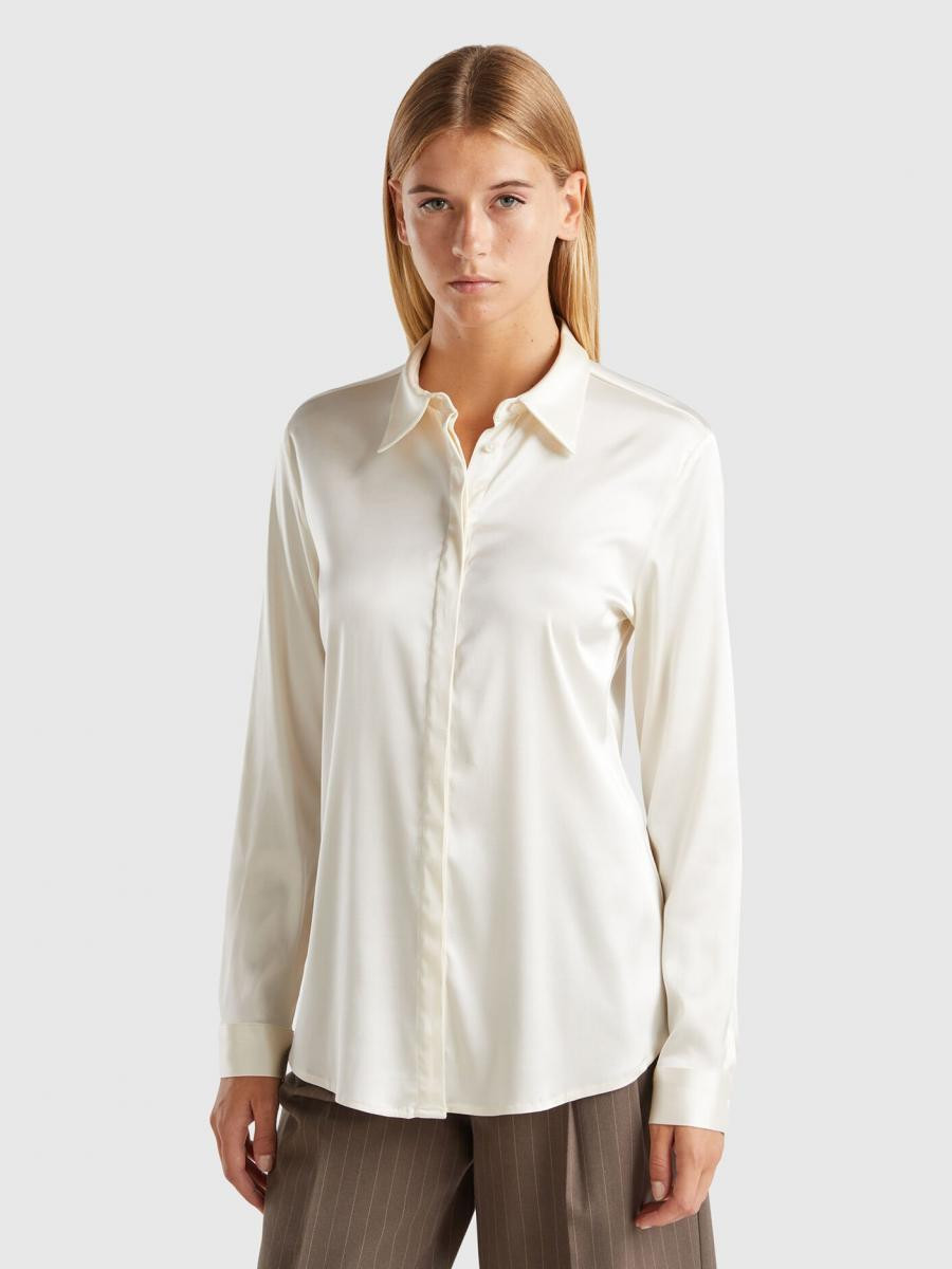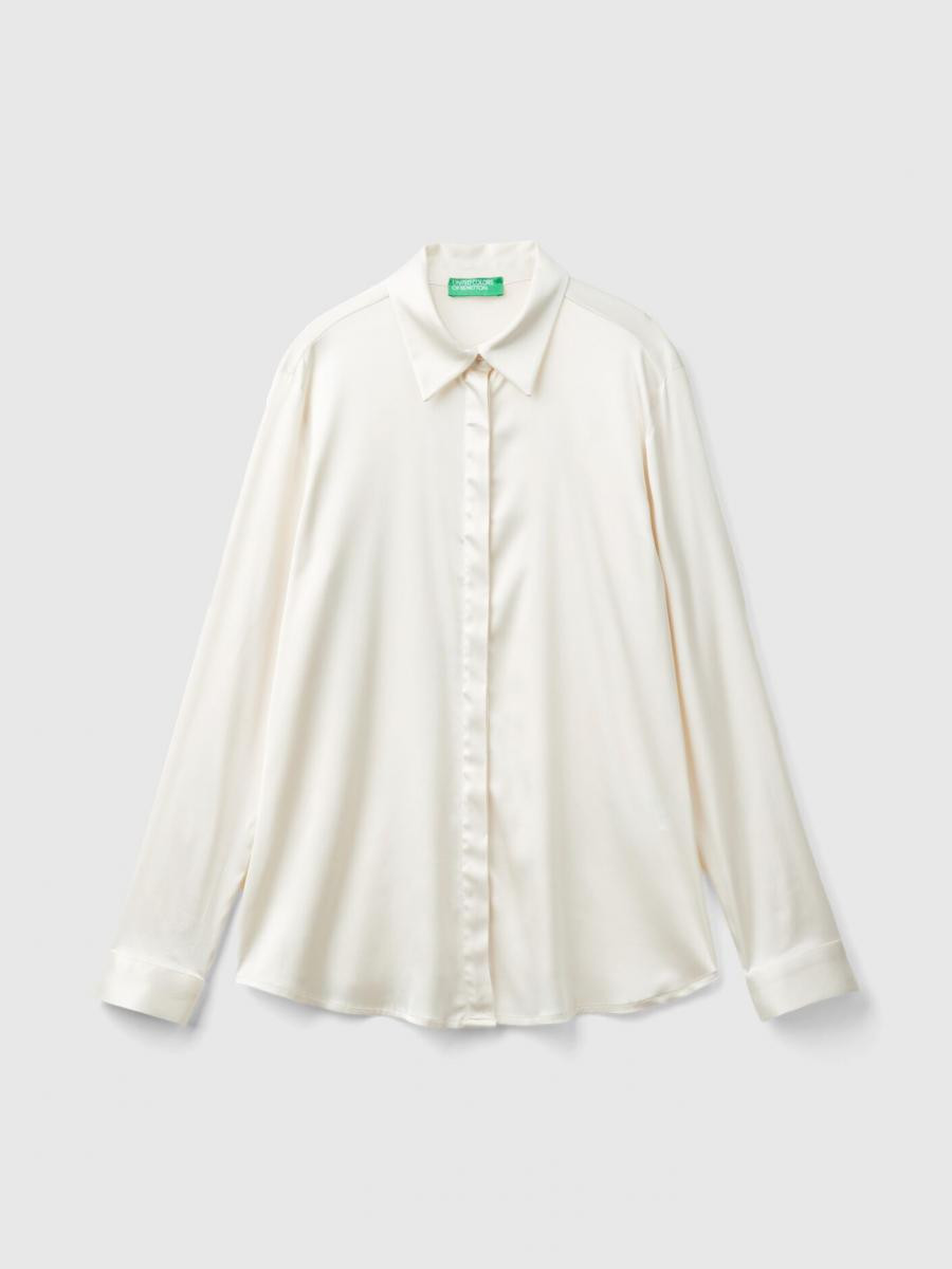 Benetton ženska košulja dugih rukava od mekog satenskog pamuka opuštenog kroja. Šiljata kragna, skriveno prednje kopcanje sa dugmadima.