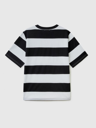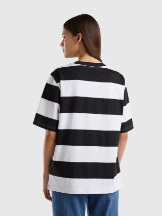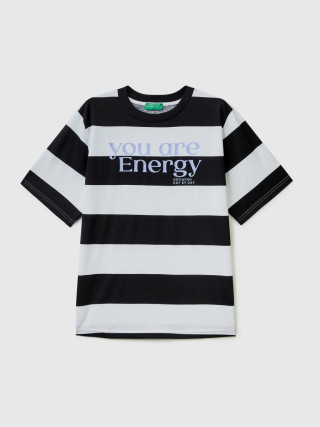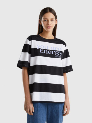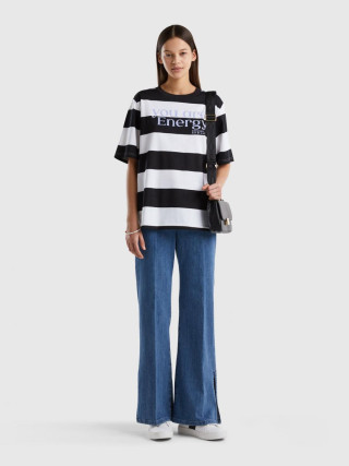 Benetton ženska majica sa okruglim izrezom kratkih rukava od čistog pamuka. Dvobojni prugasti uzorak sa grafikom slogana odštampanom na prednjoj strani.