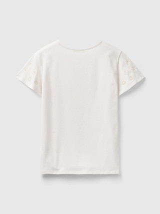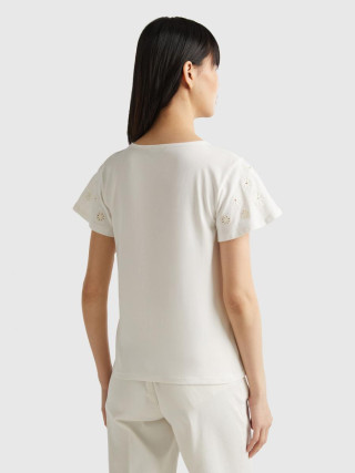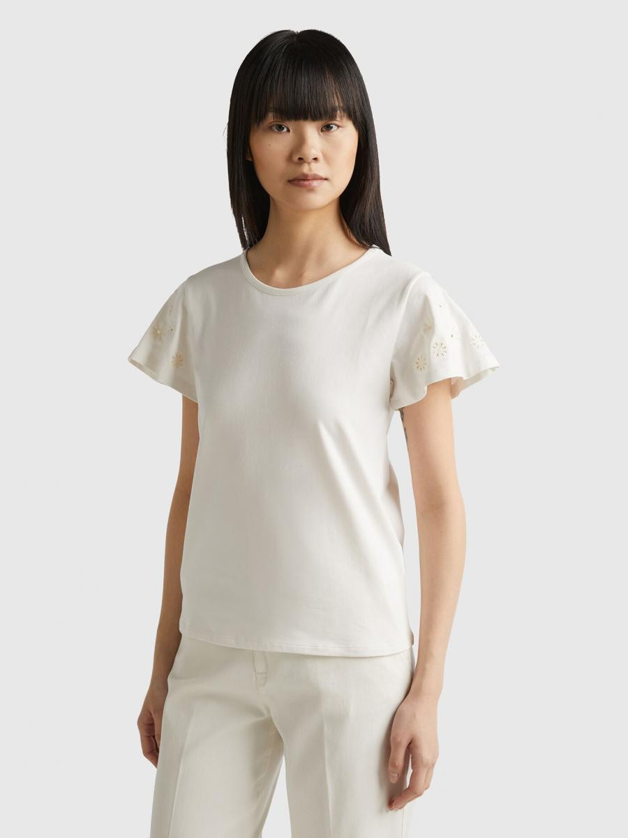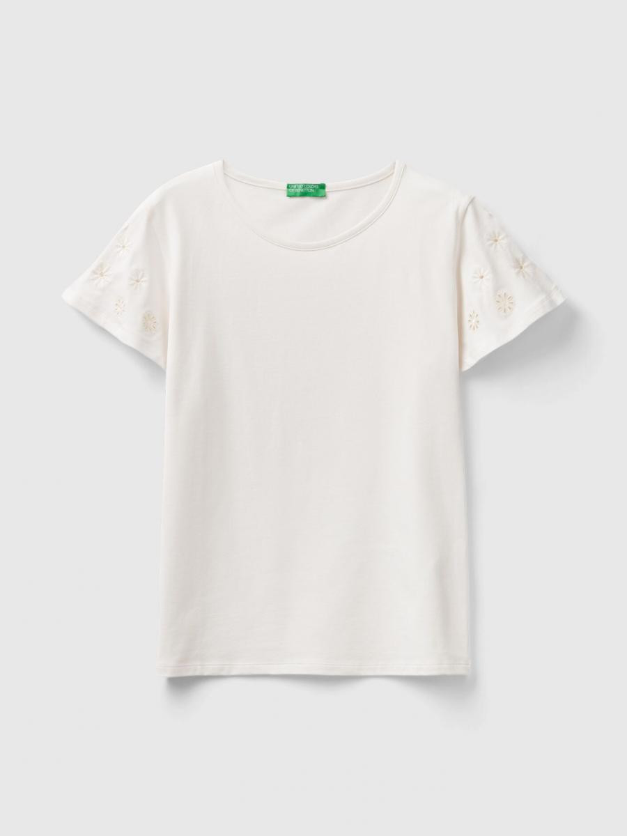 Benetton ženska majica sa okruglim izrezom od rastegljivog pamuka, sa cvetnim vezom u tonu na kratkim rukavima. Savršeno za davanje romantične i ženstvene note svakodnevnim odevnim kombinacijama.