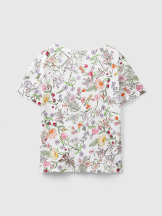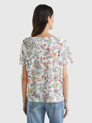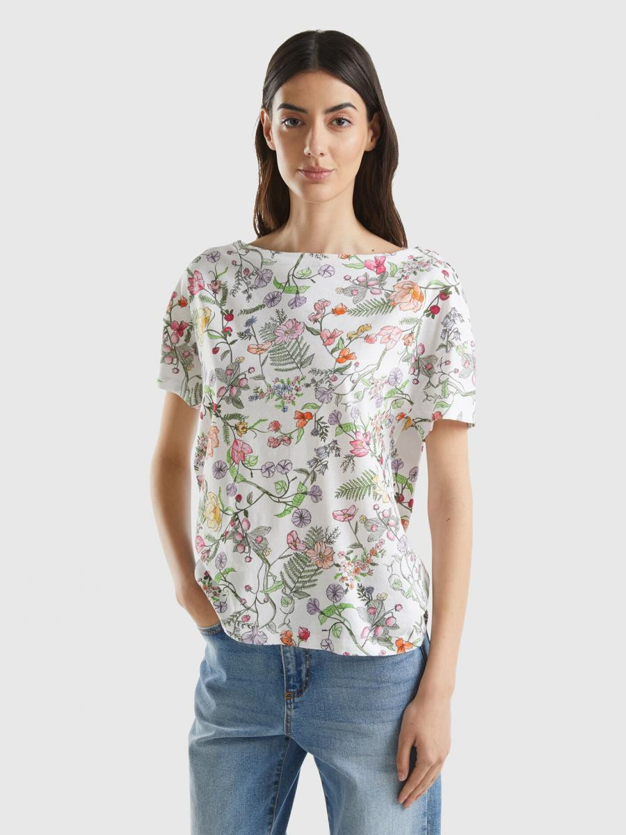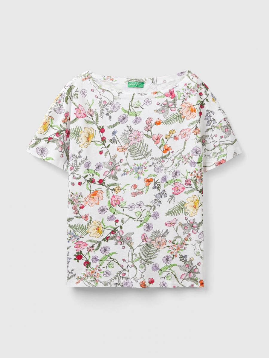Benetton ženska majica od mešavine pamuka i lana opuštenog kroja. Lagani izrez u obliku čamca, kratki rukavi sa spuštenim ramenima. Romantični cvetni print po celom odevnom predmetu, kako bi svakoj dnevnoj outfitu dao sofisticiran dodir.