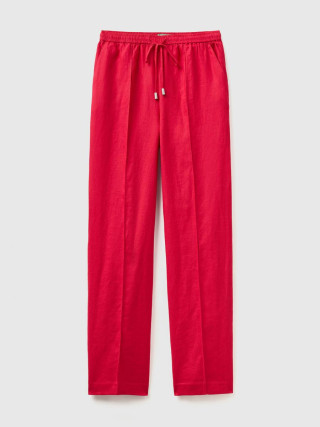 Benetton ženske pantalone opuštenog kroja. Unutrašnja elastična traka i dekorativna vezica u struku. Rebrasti detalj na sredini prednje strane nogavica, bočni džepovi. Ovaj komad je napravljen od čistog platna: otpornog biljnog vlakna koje se može reciklirati i koje troši minimalne prirodne resurse.