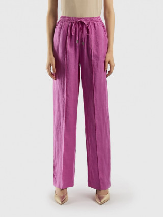 Benetton ženske pantalone opuštenog kroja. Unutrašnja elastična traka i dekorativna vezica u struku. Rebrasti detalj na sredini prednje strane nogavica, bočni džepovi. Ovaj komad je napravljen od čistog platna: otpornog biljnog vlakna koje se može reciklirati i koje troši minimalne prirodne resurse.