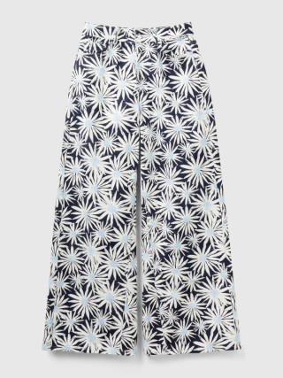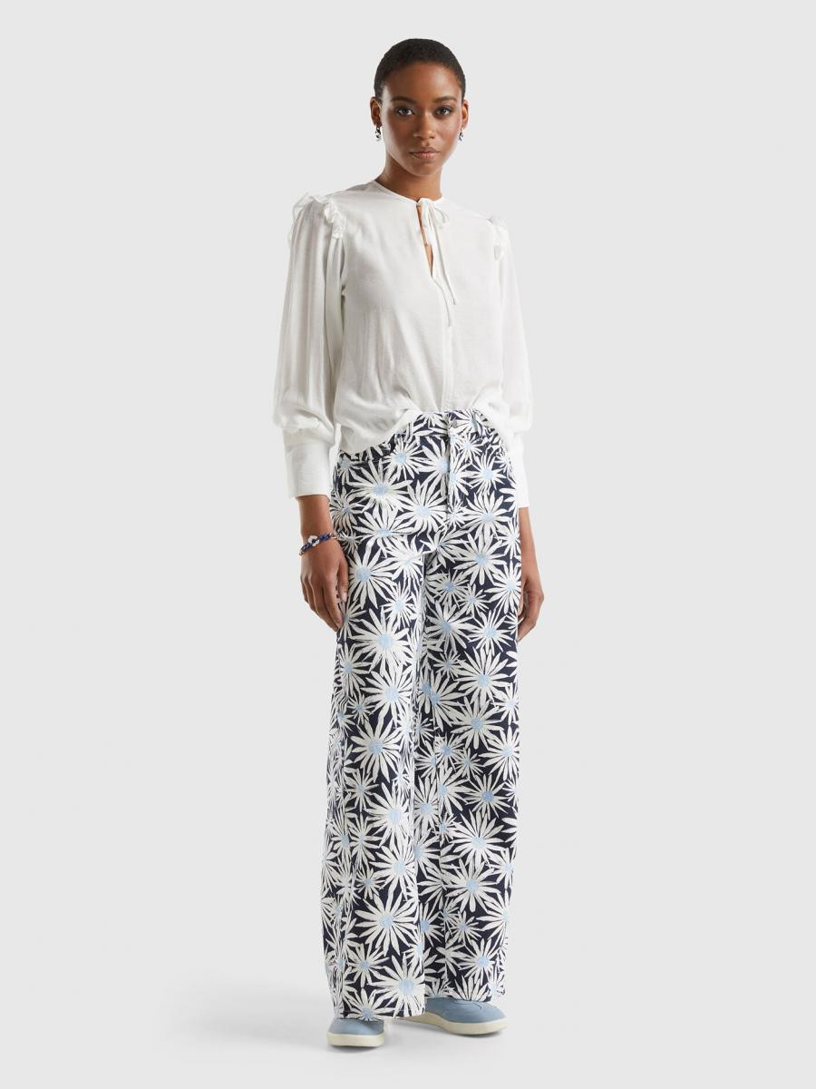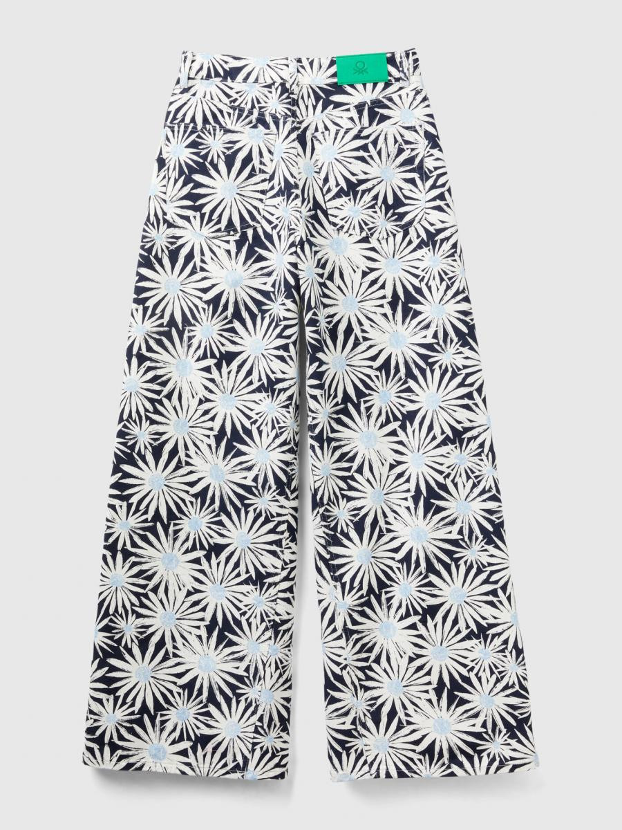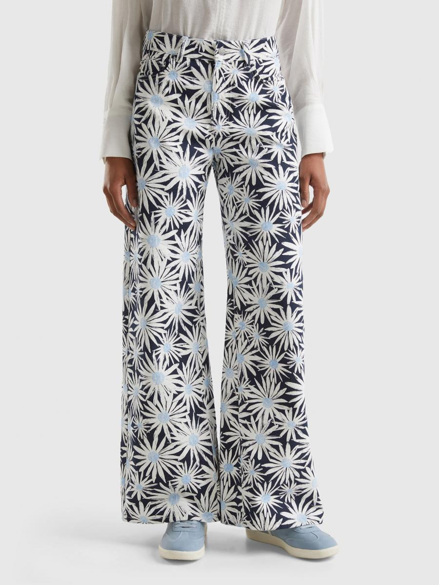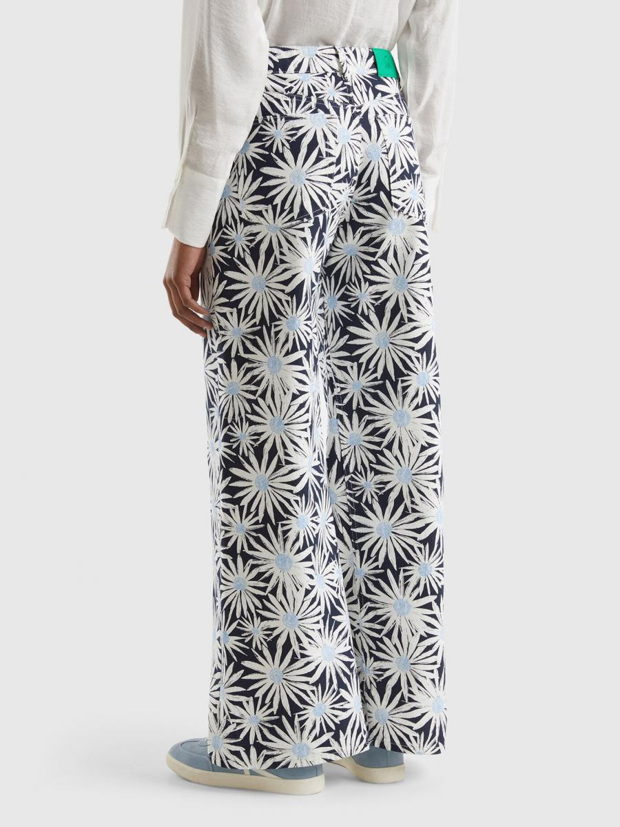 Benetton ženske pantalone od čistog pamuka sa širokim nogavicama. Dizajn sa pet džepova, visok struk, patent zatvarač i otvaranje dugmićima. Štampa sa cvetnim dezenom po celoj odec´i, za romantičnu i ženstvenu odeću.