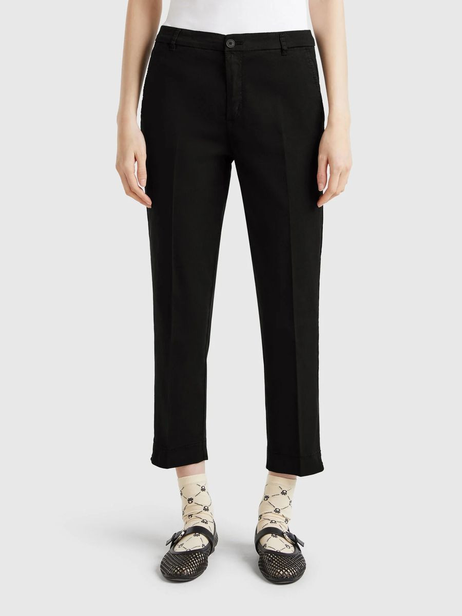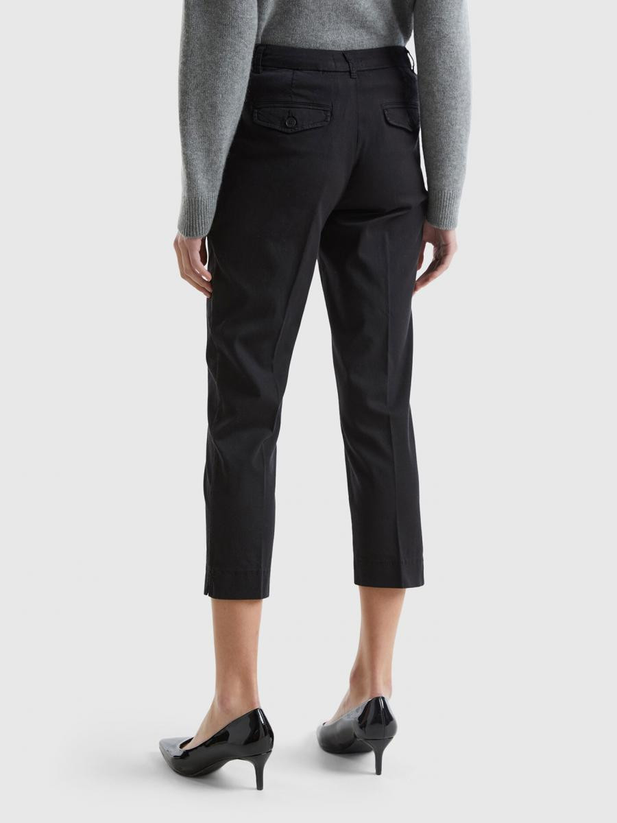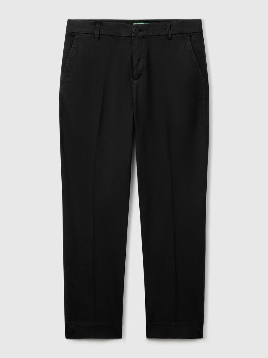Benetton ženske pantalone u chino stilu od rastegljivog pamuka poput pikea. Slim fit model blago kratkog kroja s prorezima na donjem delu nogavica. Prednji džepovi, zadnji sa naborima i džepovi sa dugmetom. Neophodne i svestrane, nosive uz patike ili štikle za svečanije prilike.