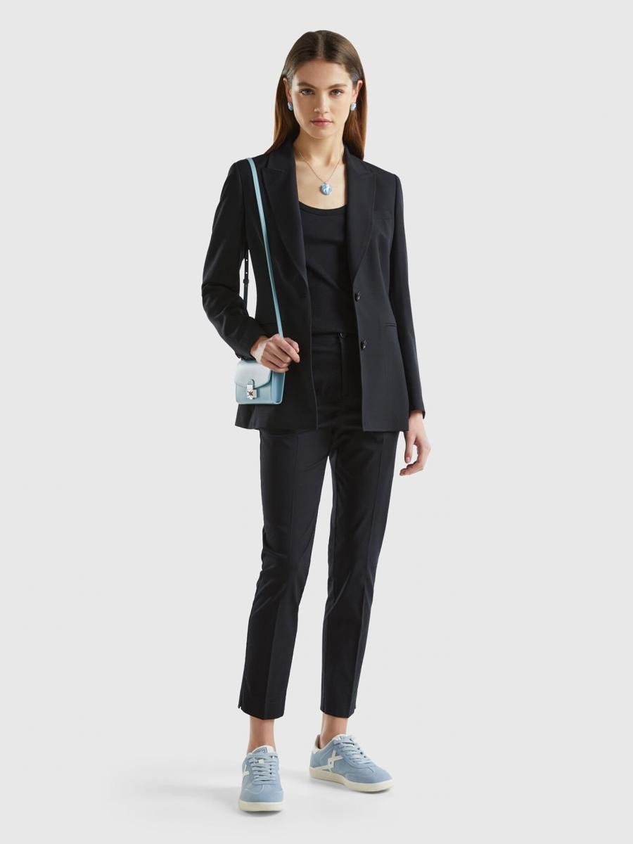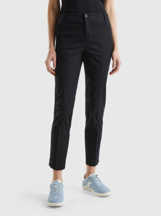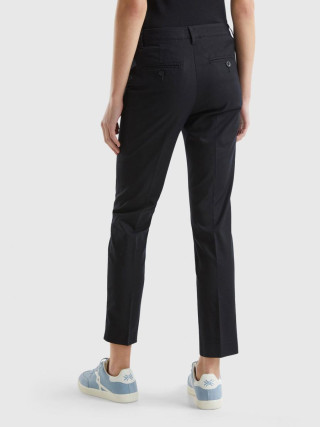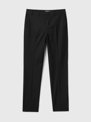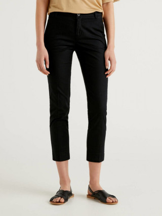 Benetton ženske pantalone chino modela od rastegljivog pamuka. Prednji džepovi i prorezi na dnu nogavice. Nabori i džepovi sa rubom sa dugmićima na leđima. Moderan stil sa čistim linijama.