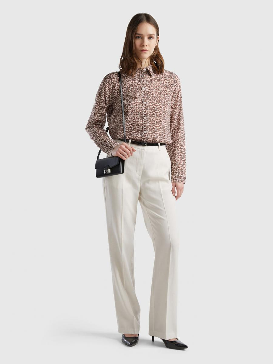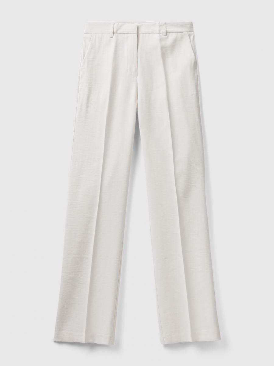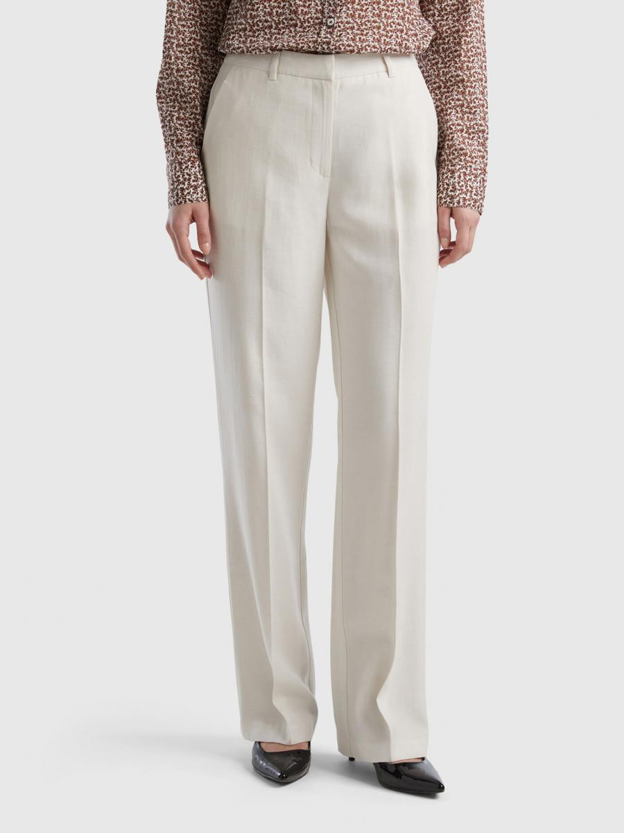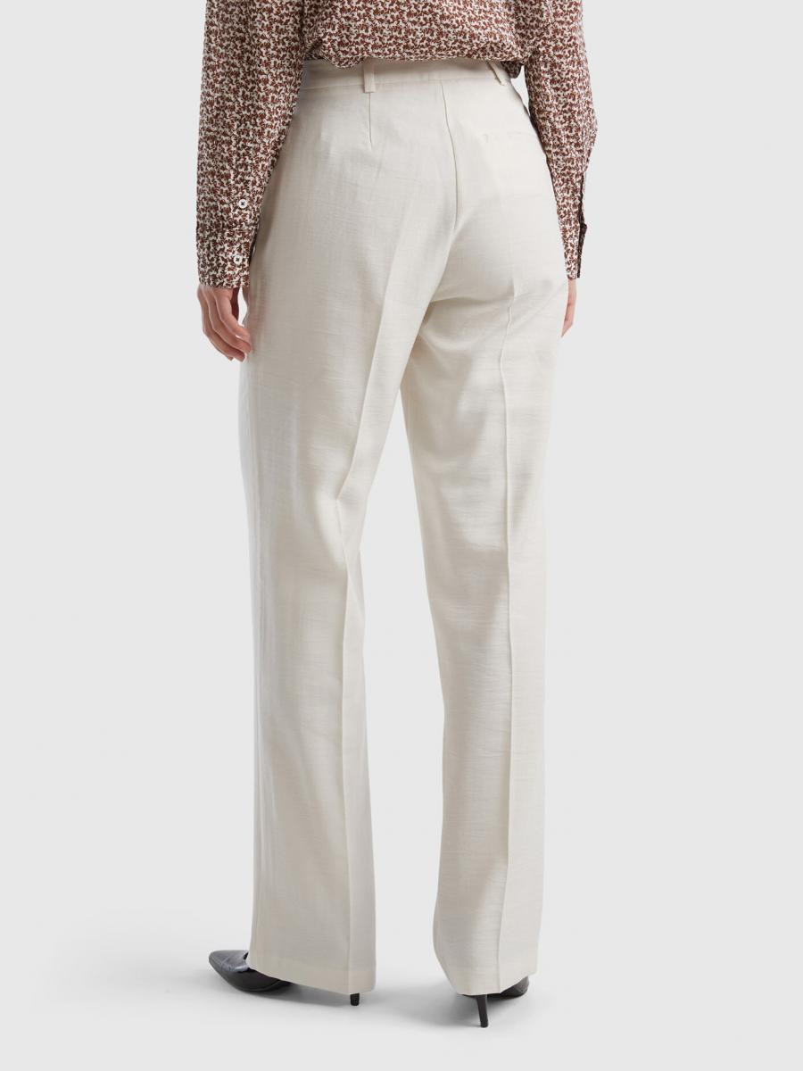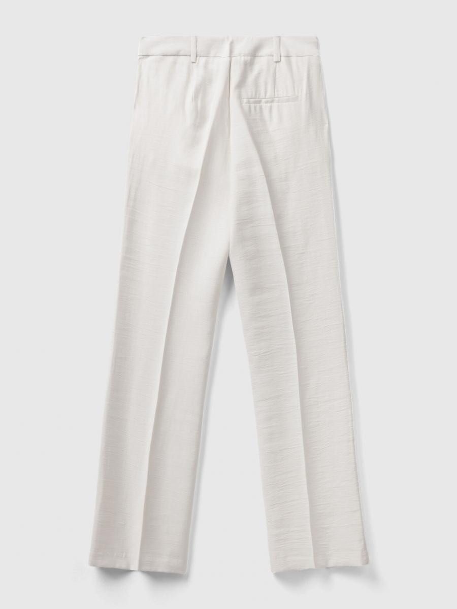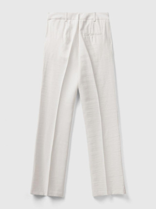 Benetton ženske pantalone od teksturirane viskozne tkanine. Tanak kroj u struku i sa strane, ravna nogavica sa centralnim naborom. Skriveni rajsferšlus i otvor za kuke, prednji džepovi i džepovi sa rubom na zadnjoj strani.