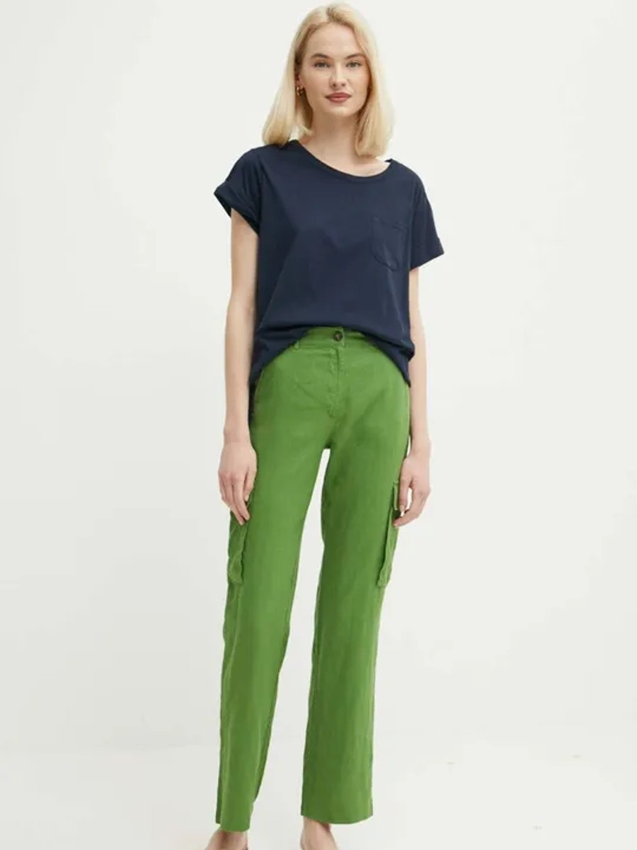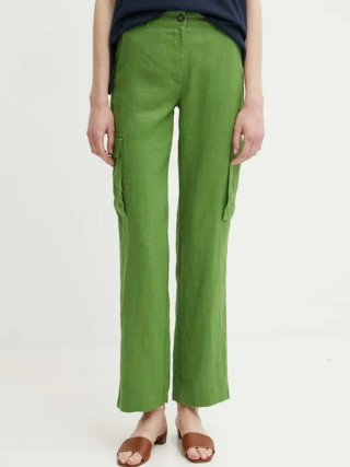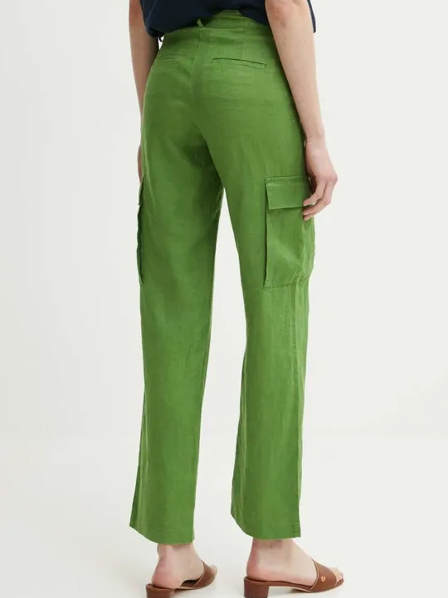 Benetton ženske pantalone u kargo stilu sa pravilnim strukom. Ravna nogavica sa velikim džepovima našivenim bočno. Kopčanje sa prednje strane sa patent zatvaračem i dugmetom, prednji džepovi i džepovi sa rubom na leđima. Ovaj komad je napravljen od čistog lana: otpornog biljnog vlakna koje se može reciklirati i koje troši minimalne prirodne resurse.