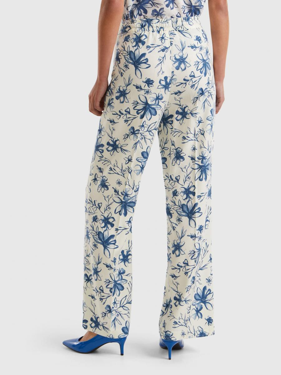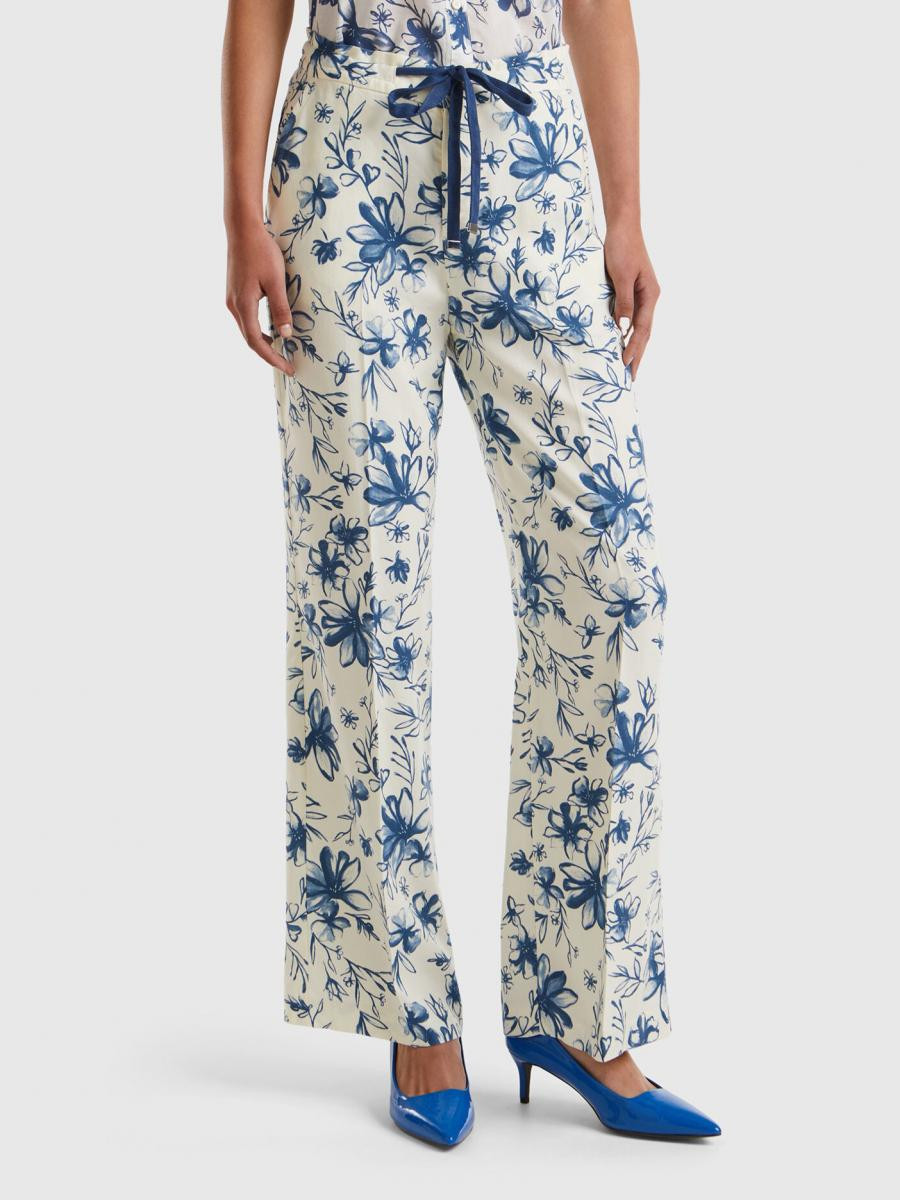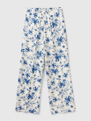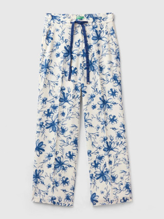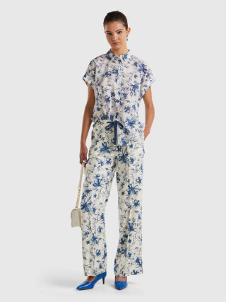 Benetton ženske lepršave pantalone sa opuštenim nogavicama i dezenom preko celog dela. Unutrašnja elastična traka na sredini leđa, podesiva vezica u struku, prednji džepovi. Otvaranje sa patent zatvaračem i dugmetom, centralni peglani nabor. Napravljen od 100% održive viskoze, proizveden od drveta iz sertifikovanih šuma, poštujući najviše ekološke standarde.